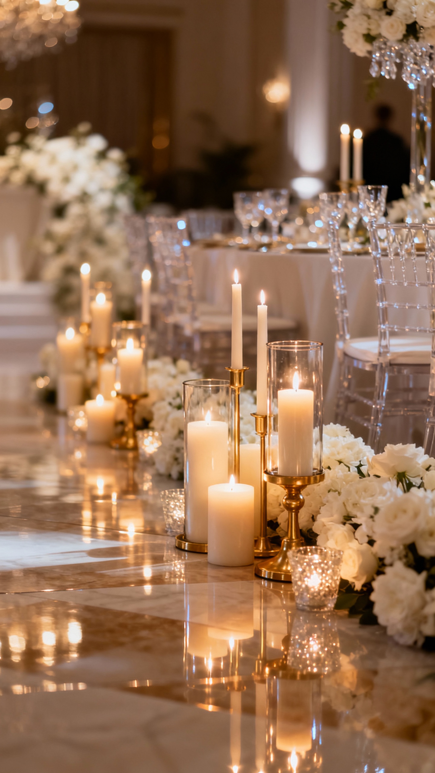 Yes. Many ballrooms require enclosed flames or LED candles, and you can still get that warm glow by using high-quality flameless pillars plus uplighting. Add reflective elements like glass hurricanes, mirrored trays, or metallic accents to amplify the light.