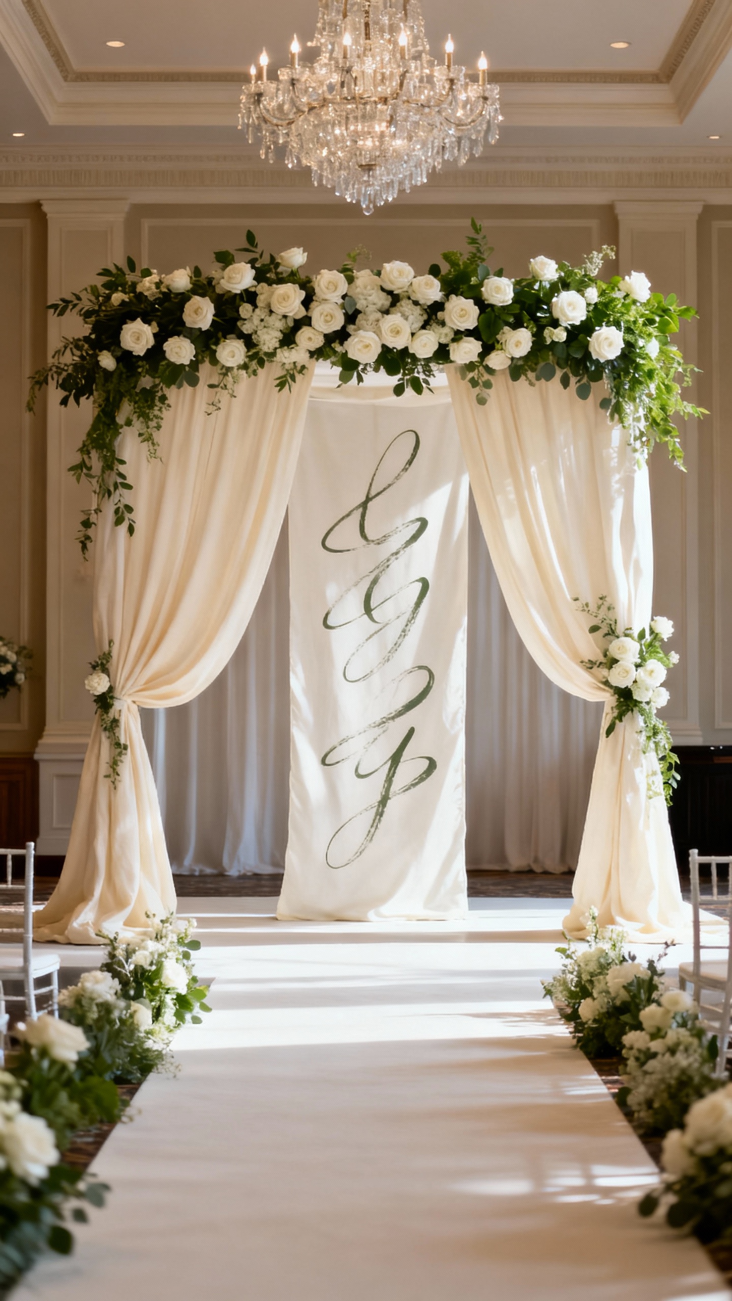 Turn your ballroom ceremony space into a soft, sacred moment with an arch that includes a small scripture phrase in calligraphy (think “Love is patient, love is kind” or “Two are better than one”). Keep it minimal: acrylic signage, a linen banner, or a gold-framed insert tucked into the florals. Choose one short verse so it reads beautifully in photos and doesn’t overwhelm the design.