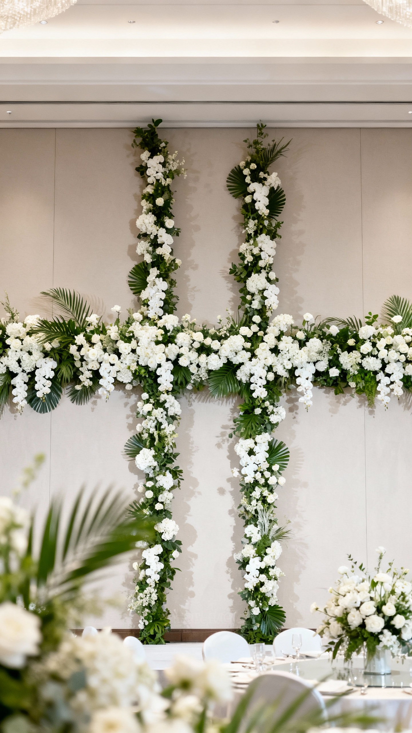 You can weave in Christian symbolism with floral lines that hint at a cross shape—like intersecting garlands on a backdrop, or aisle arrangements that create a soft “cross” layout from above. This works especially well in a ballroom where symmetry looks extra luxe. Stick to your wedding palette and let the shape be the meaning, not an obvious centerpiece “statement piece.”