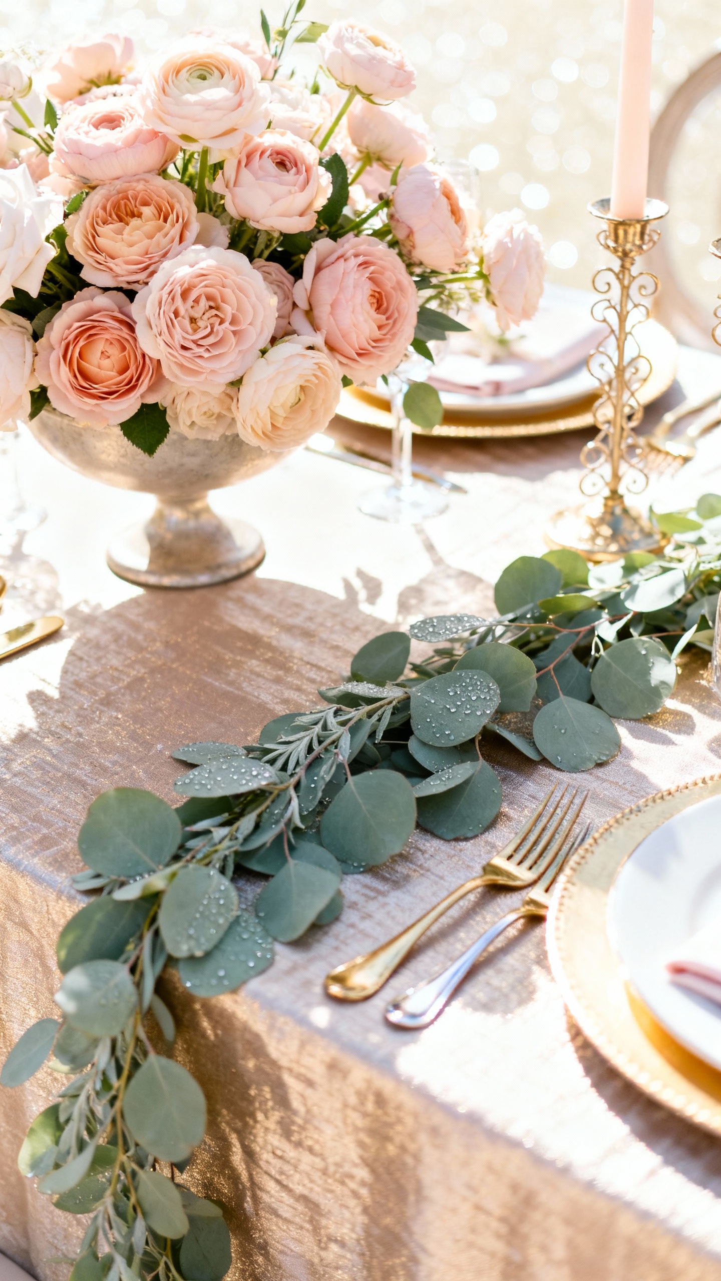 Blush and champagne read romantic and light, while sage keeps everything grounded and fresh. This one shines in spring and garden settings, especially with airy roses, ranunculus, and trailing greenery. Keep gold subtle—think thin rim chargers, delicate foil on stationery, or petite altar accents.