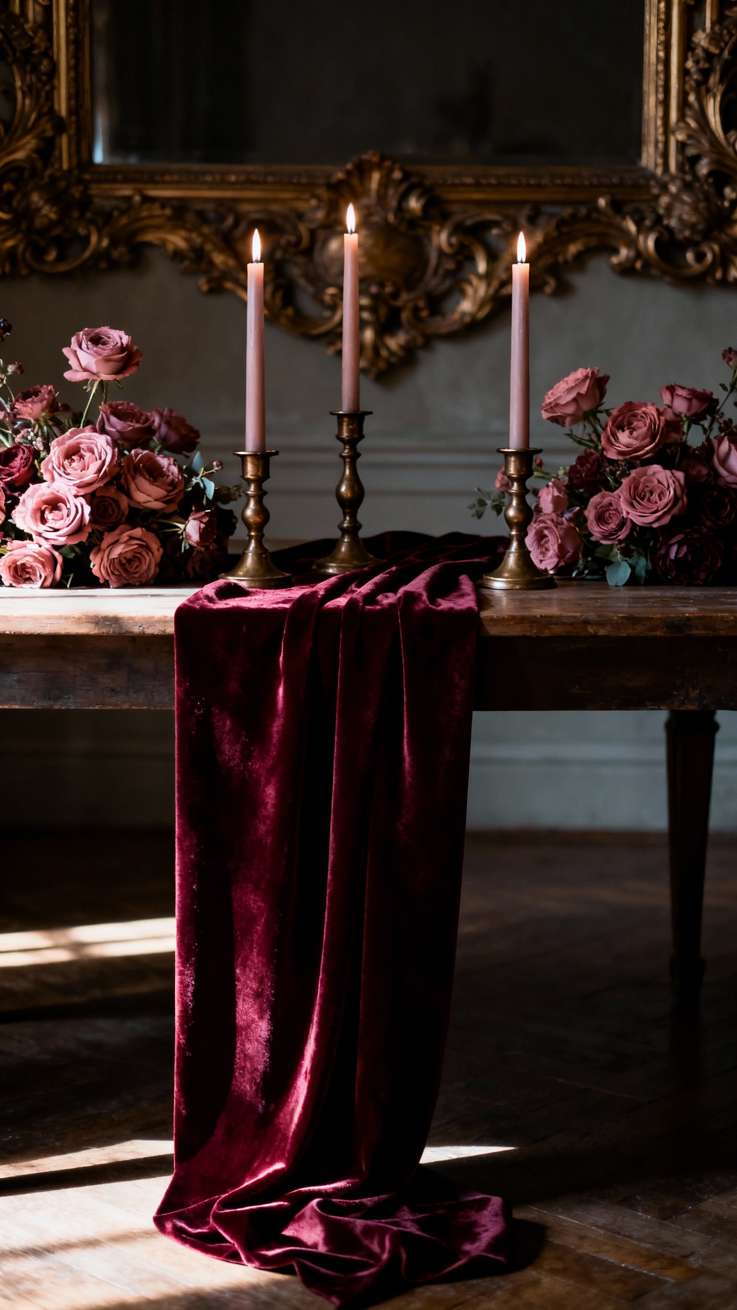 If you love Rococo drama but still want it wedding-appropriate, this palette delivers. Burgundy anchors the room (dresses, velvet ribbon, or taper candles), dusty rose keeps it romantic, and antique brass adds that vintage warmth. Balance the richness with plenty of light neutrals—ivory linens and pale blooms are your best friends here.