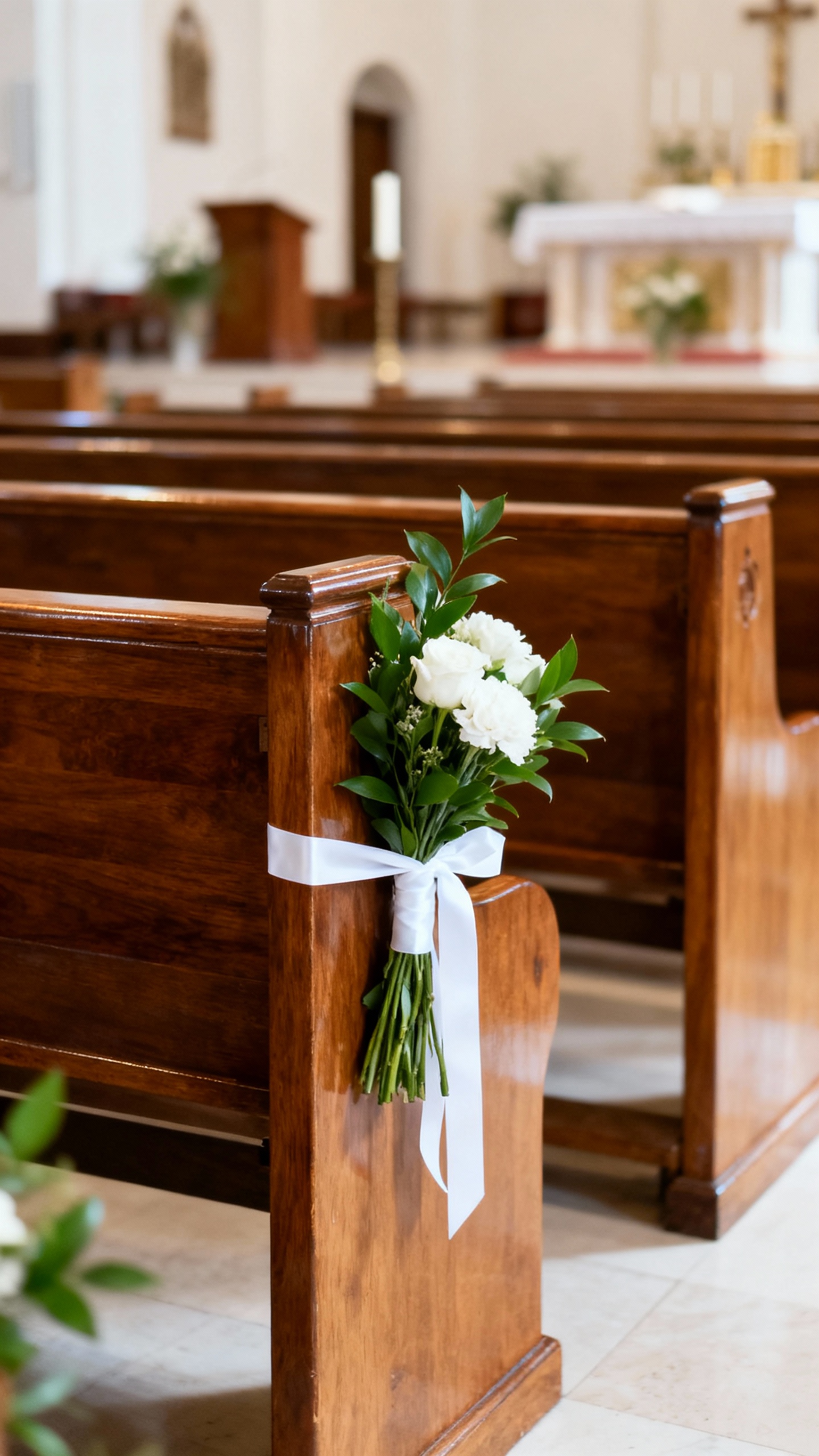 Pew markers with ribbon or small florals, a grounded aisle arrangement at the entrance, and altar florals that match your reception palette are all easy wins. Stick to classic shapes and let the church architecture do the heavy lifting for that timeless, editorial feel.