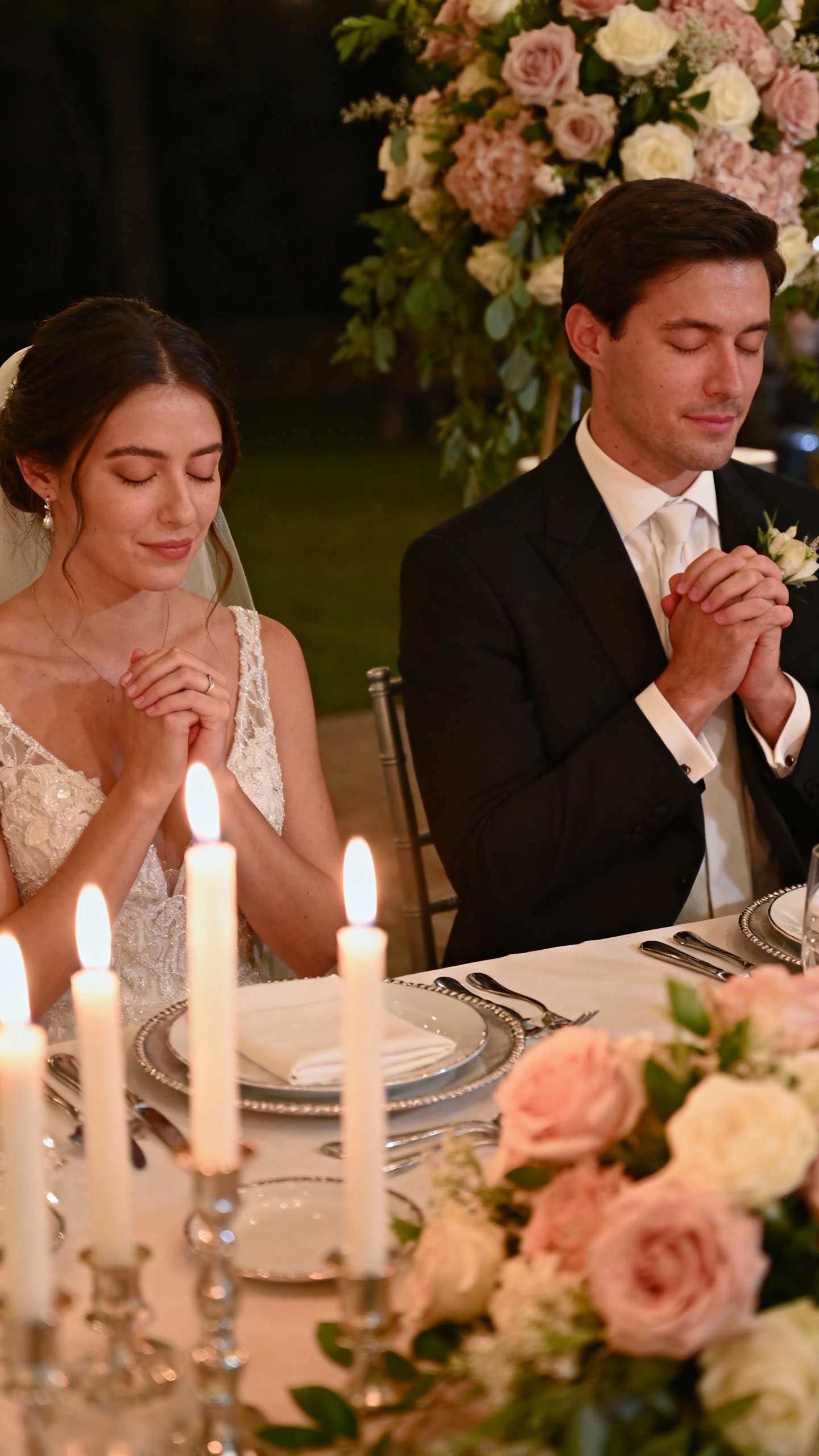 Most couples do it right before dinner is served (after the grand entrance and welcome), because it naturally transitions the room into the meal. If you’re doing a cocktail hour-heavy timeline, a prayer before dinner helps “reset” the energy and feels more intentional.