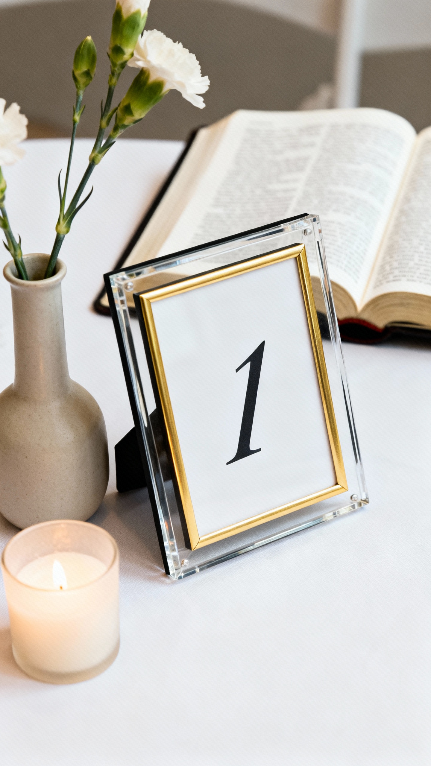 Swap basic table numbers for frames that pair the number with a meaningful verse (think: 1 Corinthians 13:4–7, Ecclesiastes 4:9–12, or Ruth 1:16). Use matching frames (gold, black, or clear acrylic) for a cohesive, elegant look. Keep the typography clean and modern, and place each frame on a small stand so it reads well from across the table.