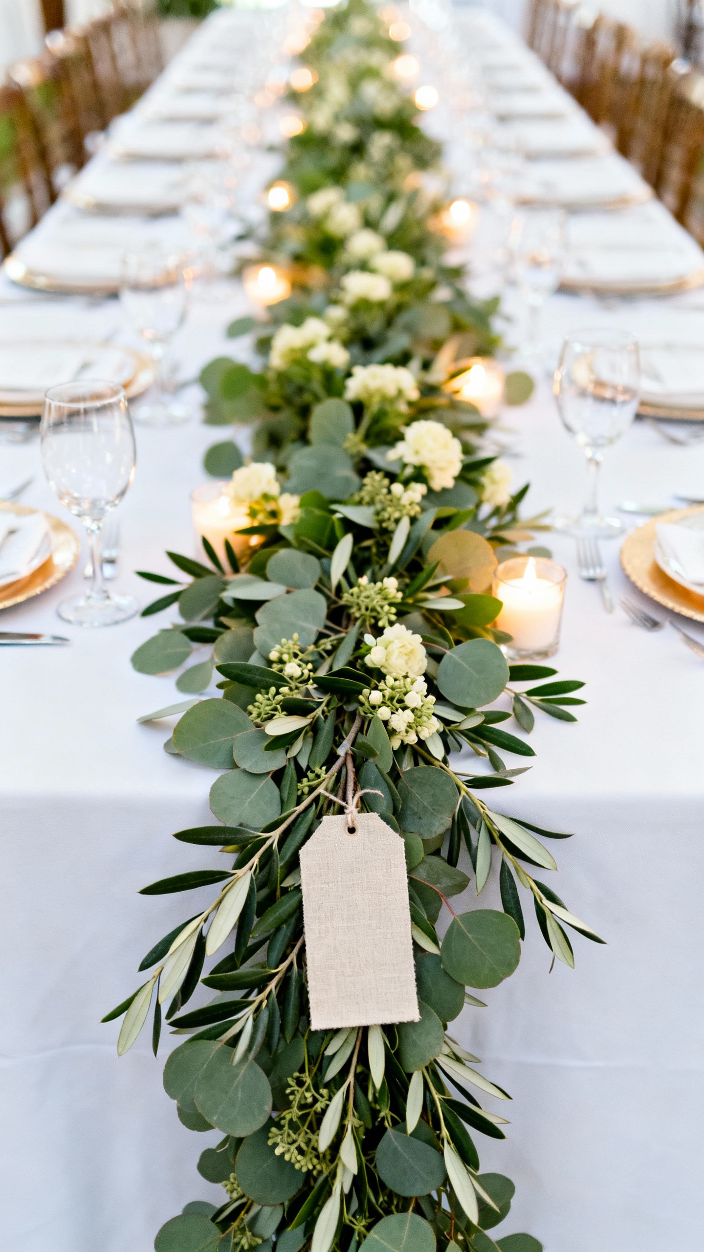 A simple garland running down the center of long tables reads expensive, even when it’s not. Add subtle Christian touches with a tiny “Blessed” tag, a small card with a short prayer of gratitude, or delicate gold place cards featuring a cross motif. Stick to one greenery type (olive branch or eucalyptus) to keep it refined, then layer in votives for sparkle.