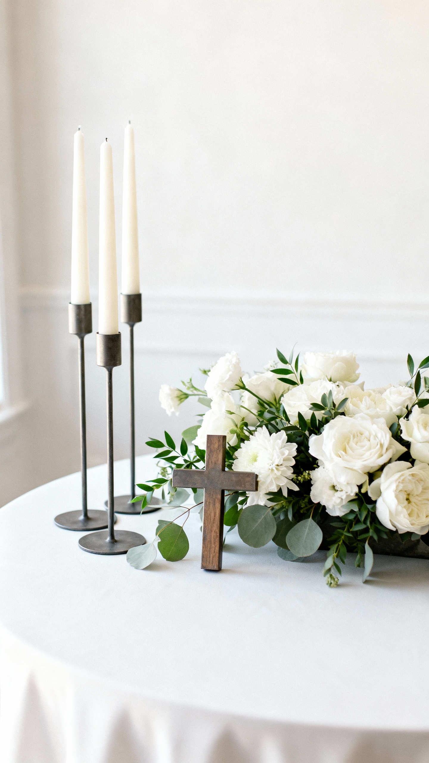 Go low (under about 12 inches) or go tall enough to sit above eye level—anything in the middle can block conversation and feel awkward in photos. For faith-inspired pieces like crosses, low arrangements with candles are usually the safest and most flattering. Always consider your venue’s table size and sightlines.