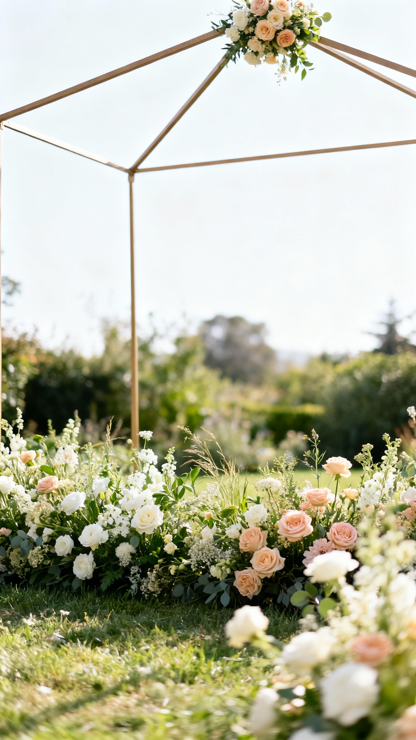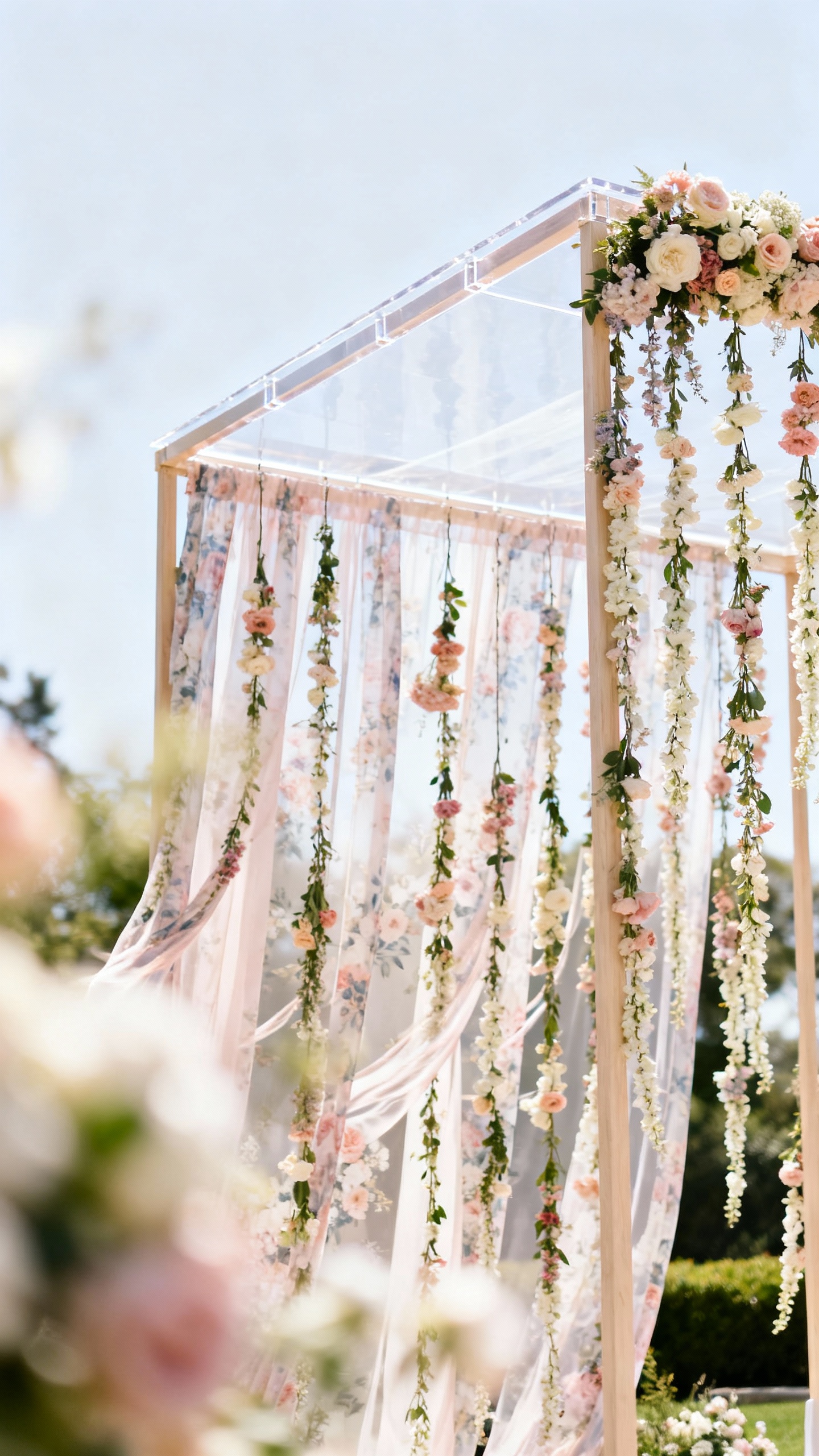 Hanging flowers (or floral garlands) create movement and depth, which looks incredible in wide shots and video. This works especially well with an acrylic or simple wood frame, because the florals become the main architecture. Choose blooms that hold up well out of water for the duration of your ceremony, and keep hanging pieces high enough so they don’t brush anyone’s hair during vows.