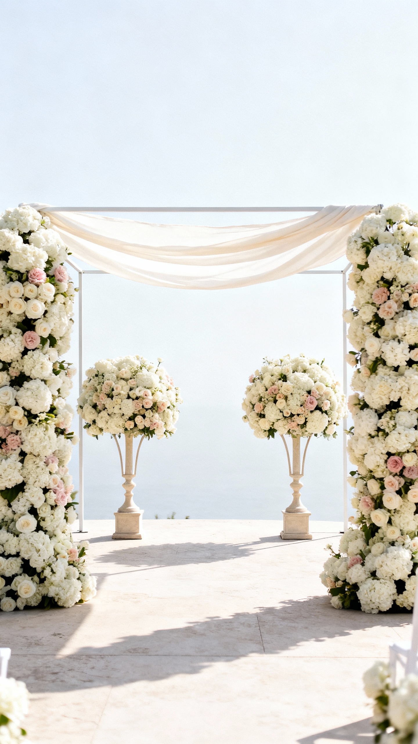 If you want a chuppah vibe but with maximum flexibility, place four floral pillars (or large arrangements on stands) at the corners and use a simple fabric tallit or canopy above. This looks stunning from every angle because the flowers are “in the round,” not stuck to one side of a frame. Bonus: it’s easier to adjust spacing for different ceremony layouts, especially outdoors on uneven ground.