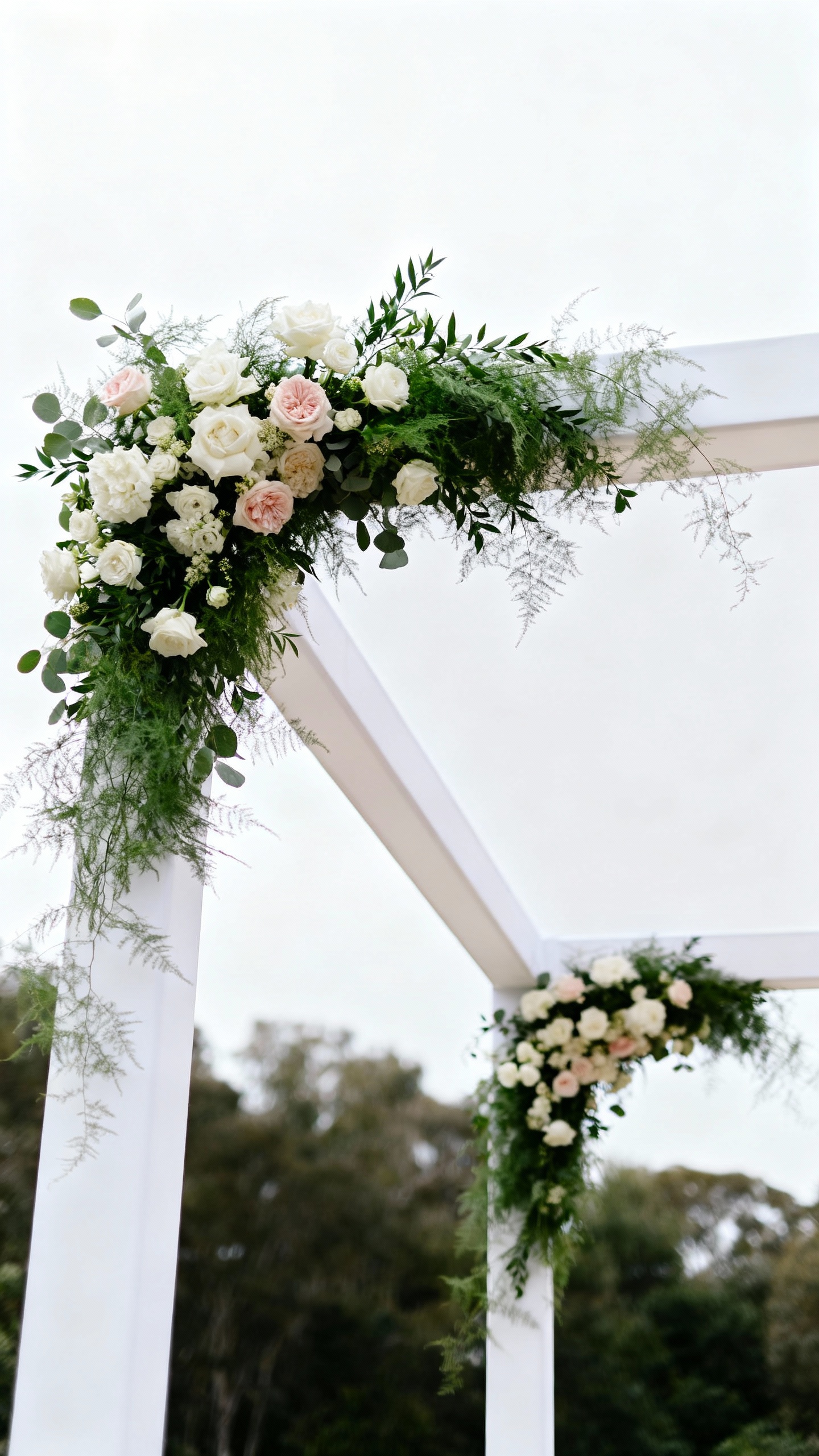 This is the “no bad angles” option: florals and greenery wrap each post and extend across the top. It reads lush from the aisle, but it’s also gorgeous from the sides where guests actually sit. Ask for a mix of textures (like garden roses + airy blooms) so it doesn’t look like one flat band of flowers in photos.