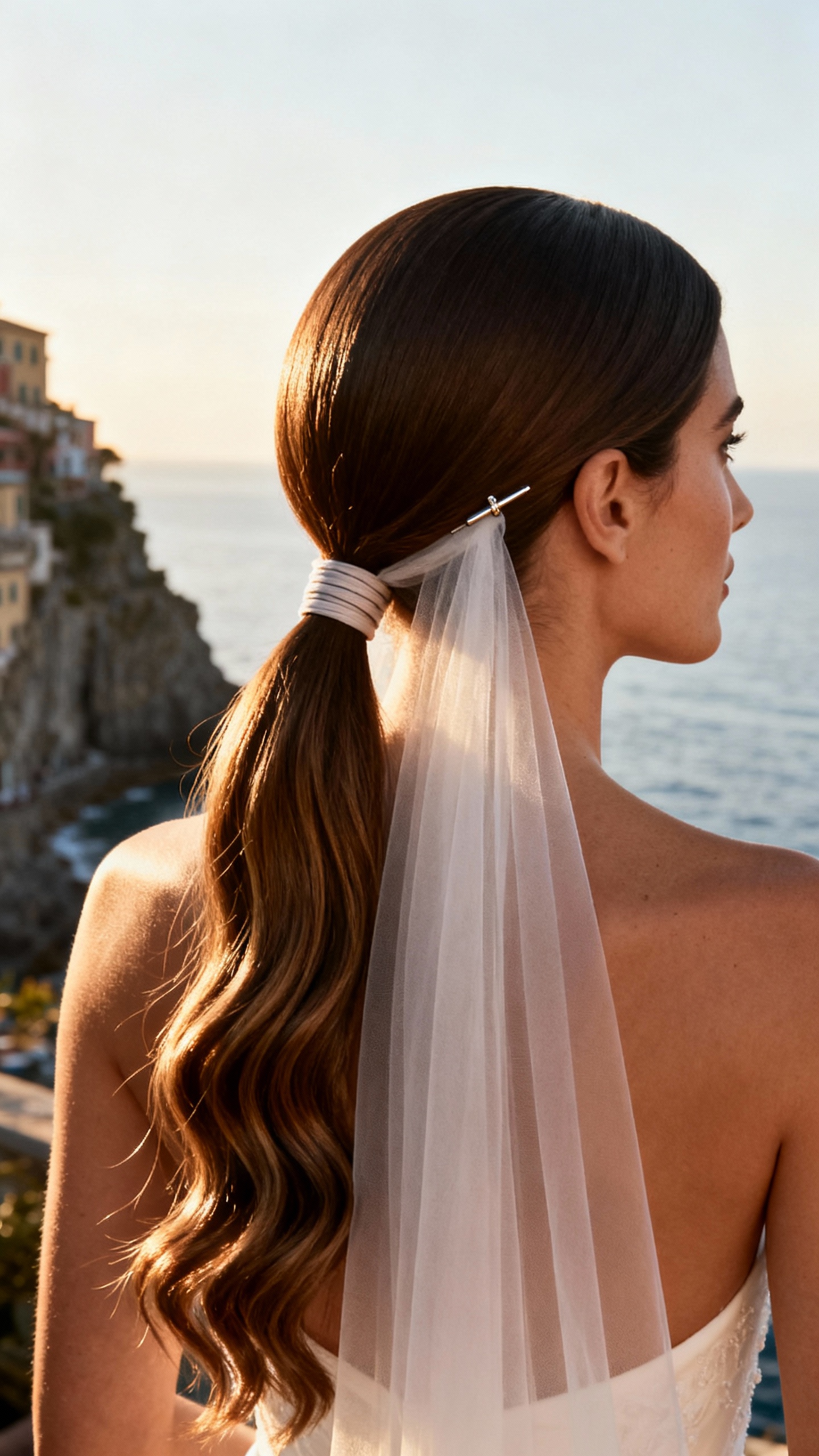 This one is modern, clean, and surprisingly coastal when you add soft S-waves through the ponytail. It flatters brides who love a snatched silhouette, and it’s great for fine-to-medium hair because it creates a longer line without needing a ton of volume. The vibe reads chic Italian minimalist—especially gorgeous with a simple veil and statement earrings. Practical tip: use a silicone-lined elastic and wrap a hair section around it, then set the pony waves with a light serum to reduce tangling in sea air.