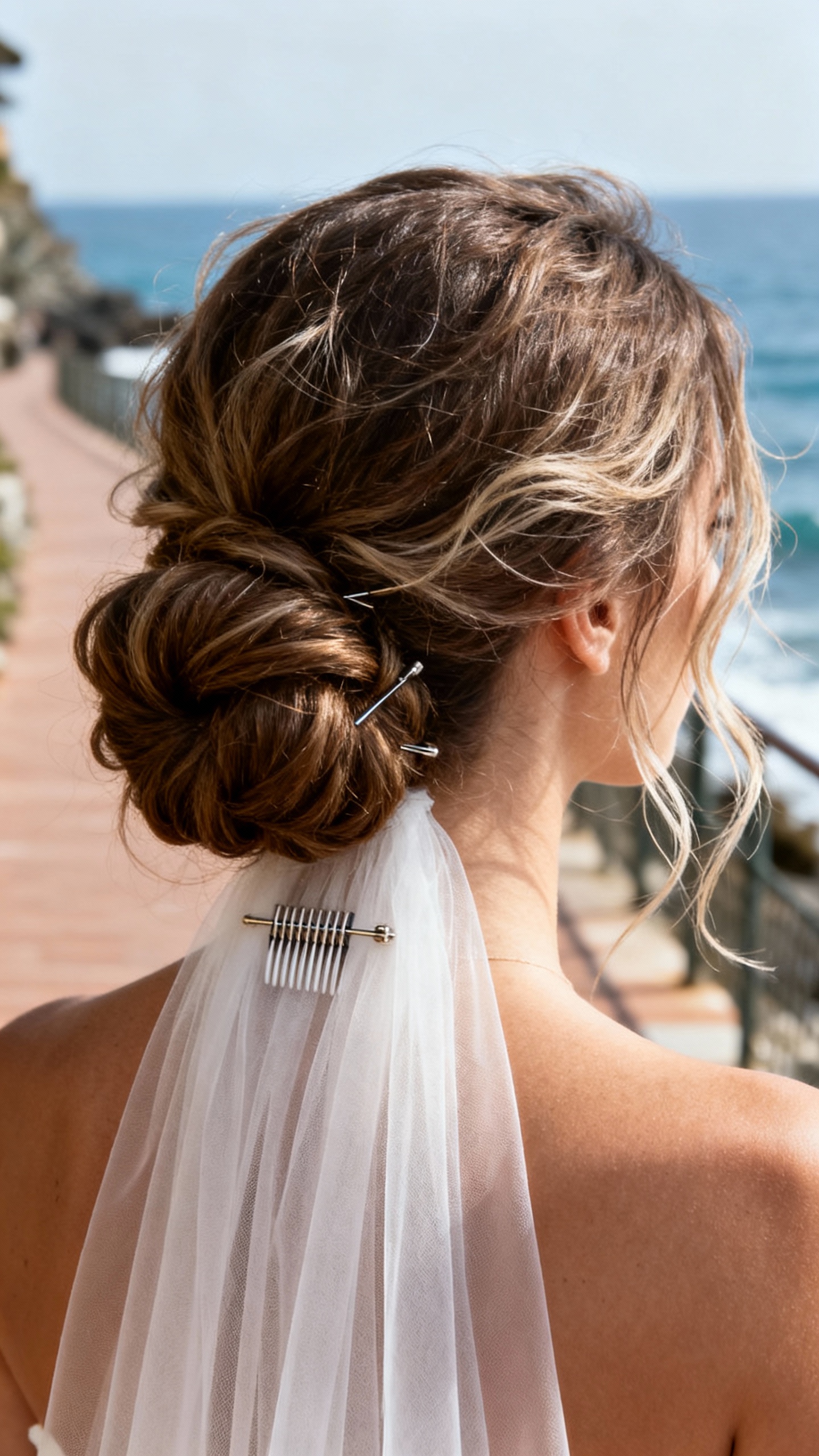 This is the ultimate “won’t betray you in wind” style while still feeling soft and coastal. It flatters pretty much everyone, especially oval, heart, and round face shapes, because the low placement elongates the neck and looks elegant from the side. Keep the chignon slightly undone with face-framing pieces for that Italian-riviera vibe. Practical tip: place the veil under the bun and anchor it with two crossed bobby pins plus a mini comb for all-day security.