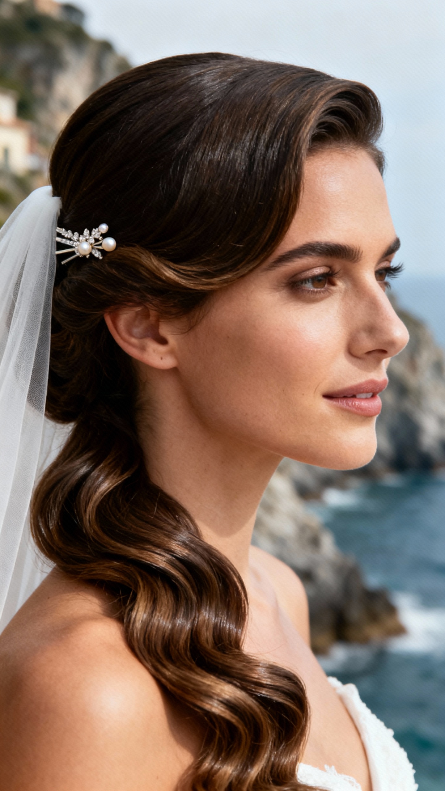 Side-swept waves are pure cinematic romance—think soft, glossy movement that photographs beautifully against coastal backgrounds. It flatters round and heart face shapes because the diagonal line adds structure, and it’s a dream if you want a little old-Hollywood moment without feeling too “done.” The key is controlling the veil so it doesn’t fight your wave pattern. Practical tip: pin the veil low on the heavier side (behind the ear line) and secure it with two mini hairpins hidden under the top wave ridge.