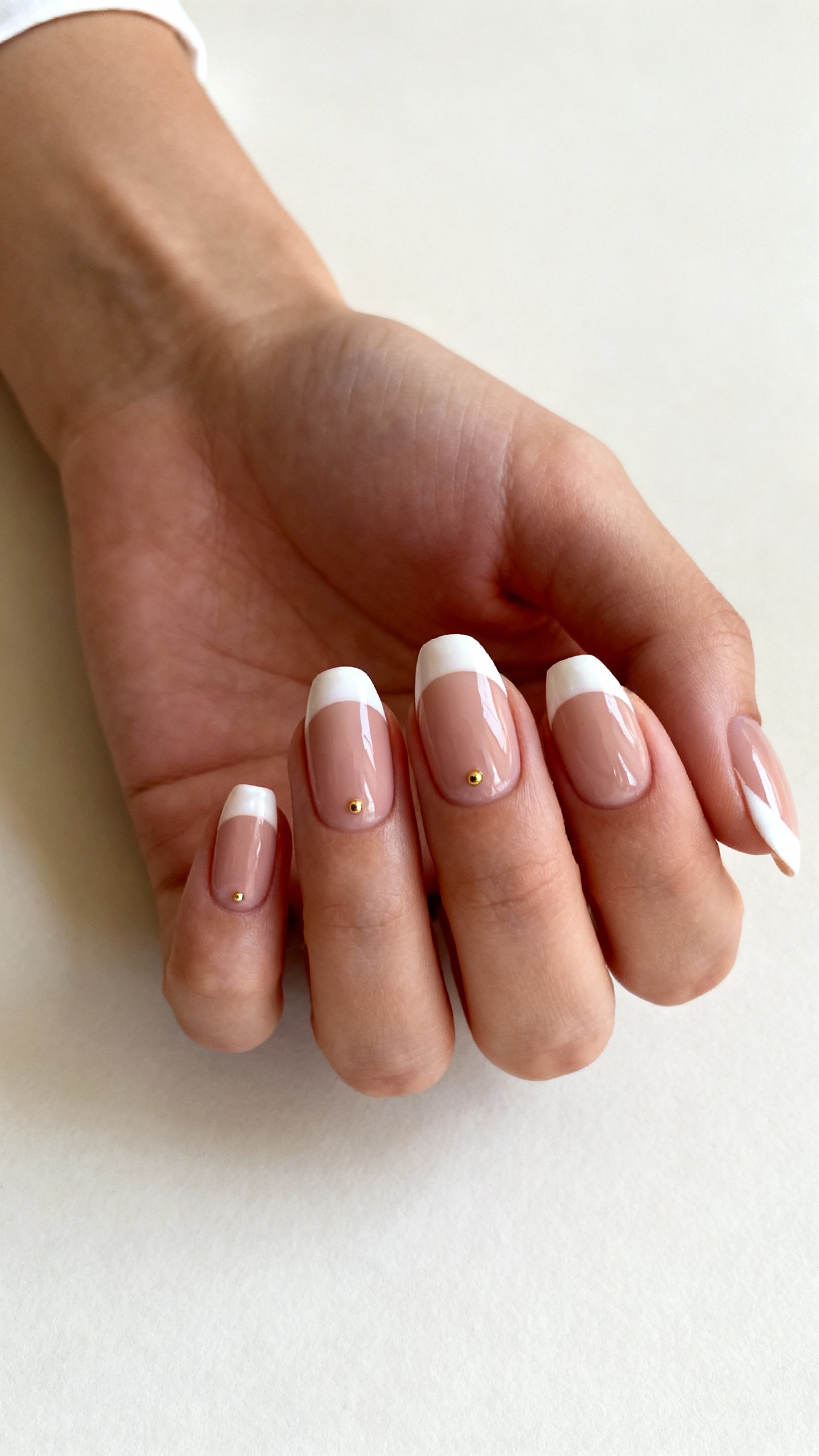 If you want minimal but special, do a nude-pink base with pearl-white tips (softer than bright French) and add tiny gold studs or a delicate gold charm on one or two accent nails. It reads like nail jewelry—elevated, coastal, and perfect with gold earrings or a pearl veil. Try short-to-medium squoval for that clean “rich girl manicure” vibe that survives luggage handles and wedding prep. Wear tip: for charm or stud accents, ask for them to be encapsulated in builder gel so they don’t snag on your dress or hair.