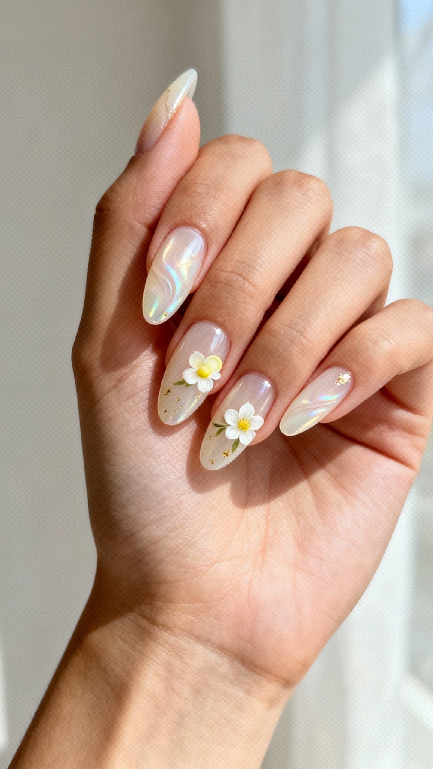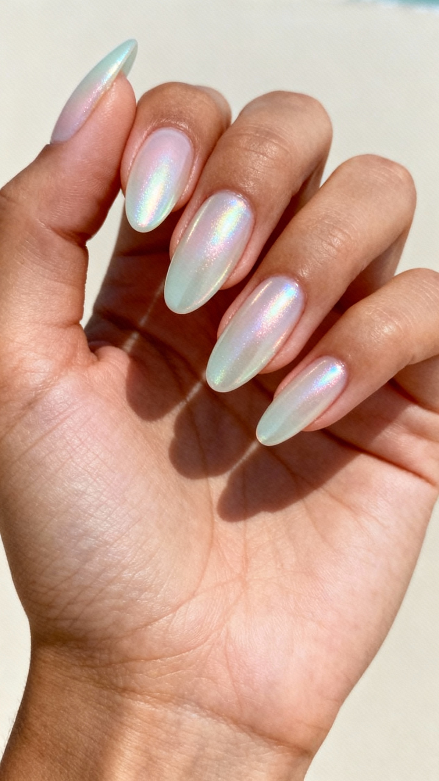 Think coastal pearl, not glitter: a translucent blush or milky base topped with a pearly chrome glaze that shifts like sea foam in the light. It’s timeless, romantic, and looks expensive with minimal effort—perfect if your dress has satin, pearls, or soft lace. Best on medium almond or squoval to show off that luminous sheen without looking too long for travel days. Wear tip: ask your nail tech for a non-yellowing top coat so flash photos keep the pearly glow (not a warm cast).