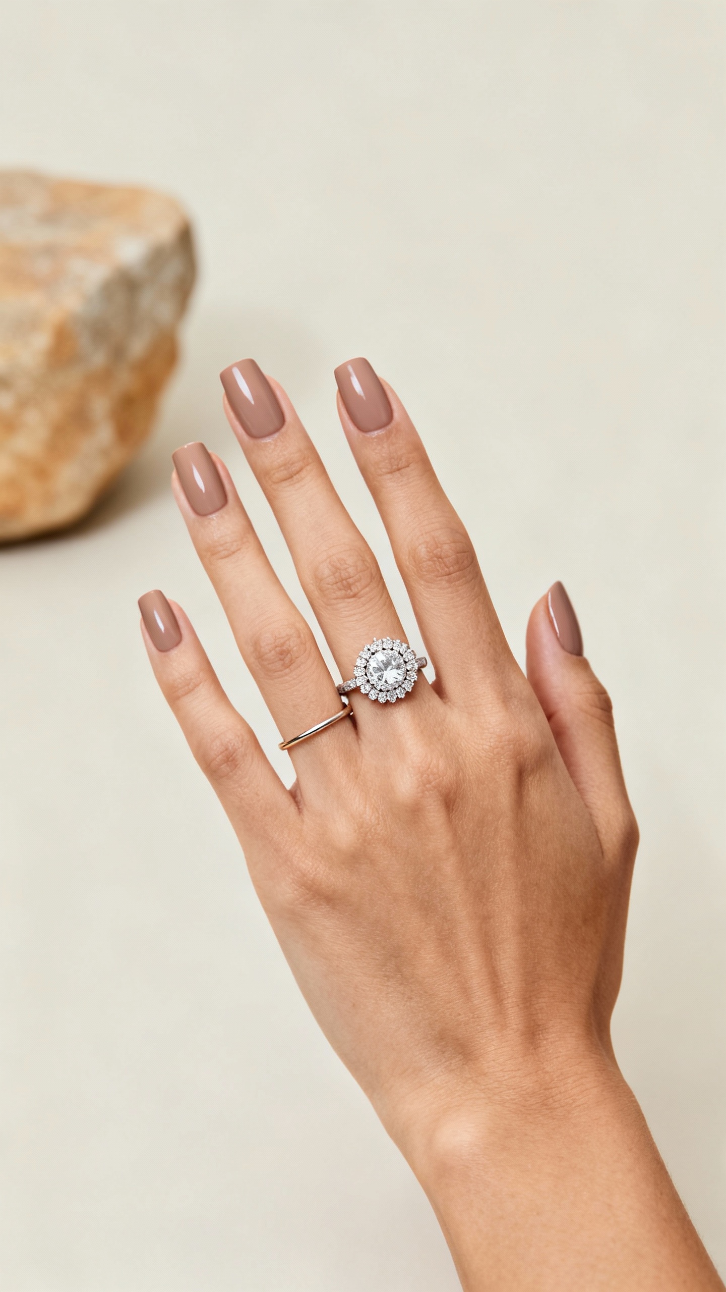 This warm taupe-beige cream is pure coastal stone and designer handbag energy—neutral, sophisticated, and quietly bold. It looks especially luxe with diamond halos and pavé bands because it creates contrast without stealing attention. Choose short squoval or short almond for a clean, modern finish that won’t snag on lace or hair. Wear tip: a cream shade shows tip wear faster than sheers, so ask for a gel top coat with high gloss and apply cuticle oil daily to keep the whole manicure looking freshly done.
