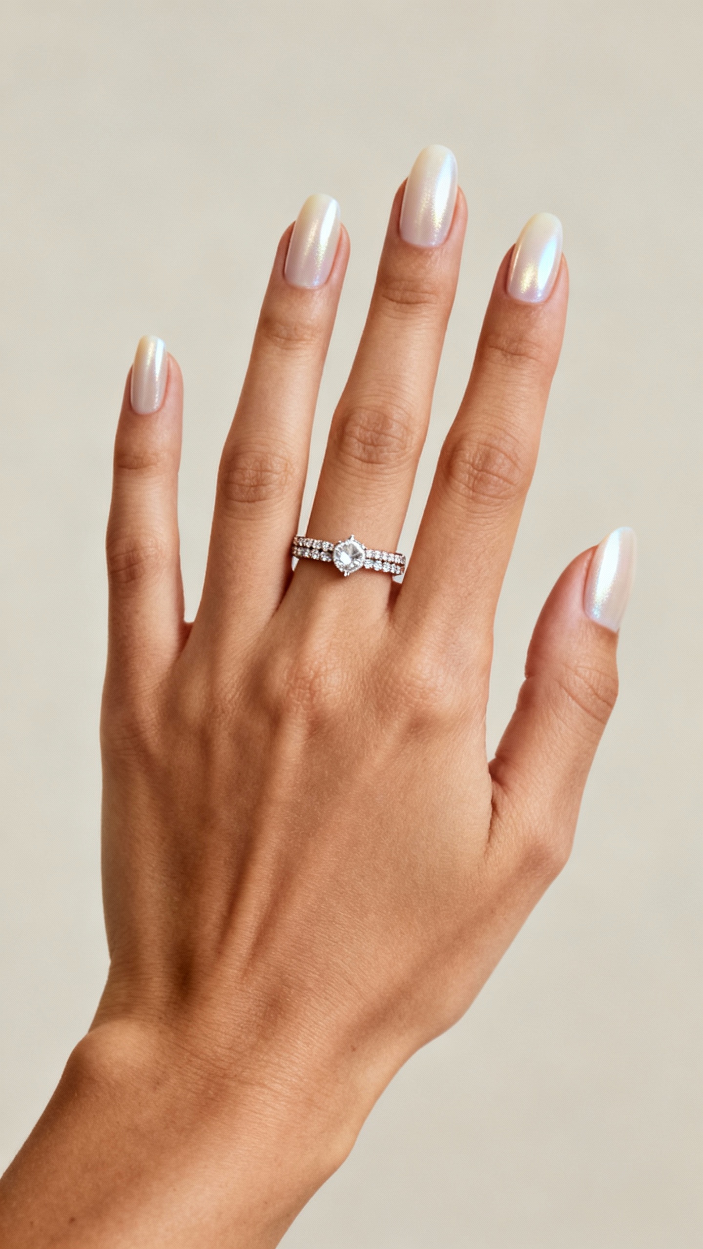 Stick to one main finish: creamy, sheer, micro-French, or pearl glaze—don’t mix multiple accents. Keep contrast low (milky tones, warm nudes, soft pastels) and skip chunky glitter or heavy patterns. The goal is a manicure that frames the ring instead of fighting it.