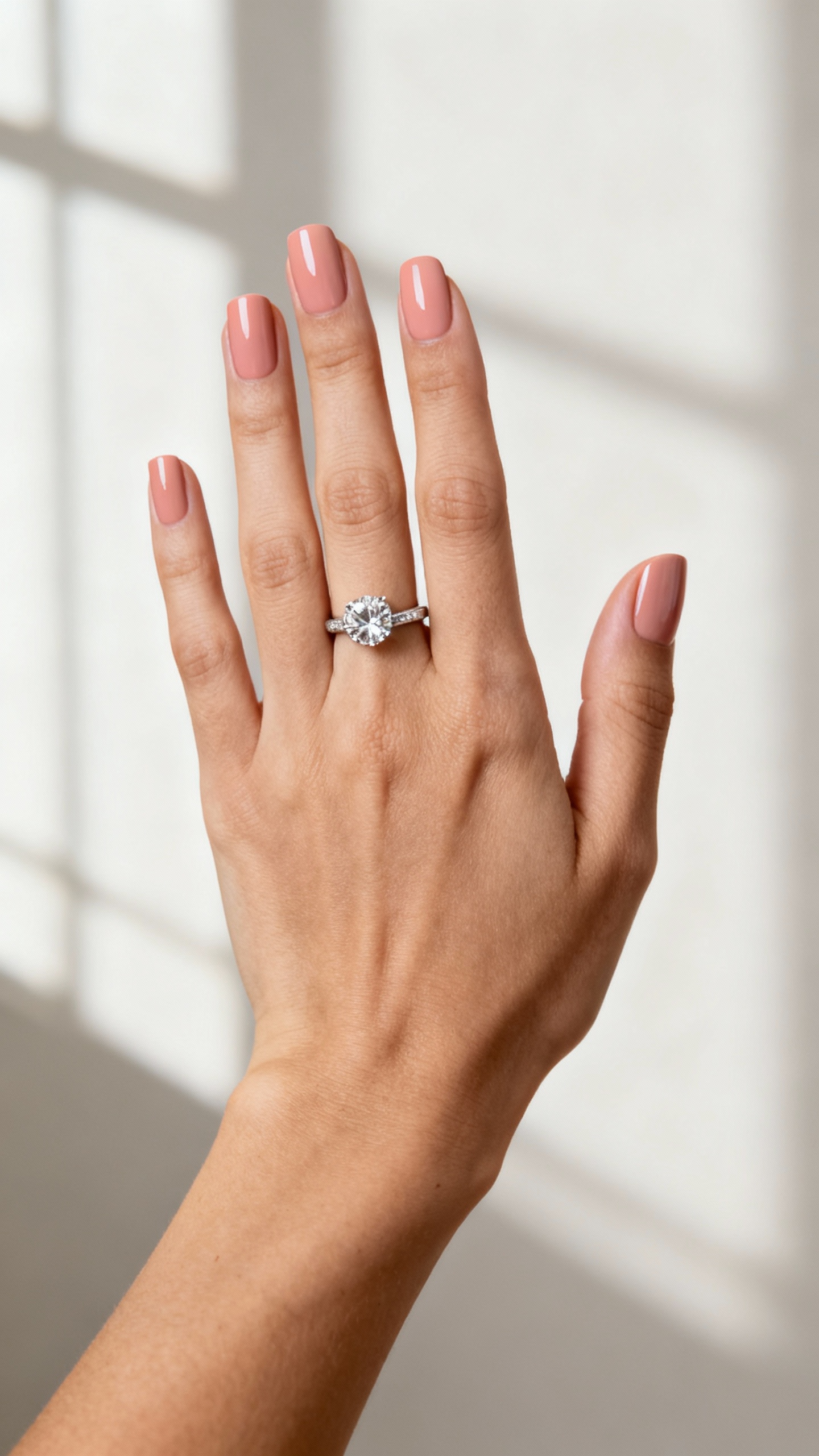 Almond and oval are the most flattering for close-ups because they elongate the fingers and look soft next to a sparkly ring. If you want something more modern and low-maintenance, short squoval photographs clean and tidy. Keep your length practical—anything that makes you curl your fingers will show up in ring shots.