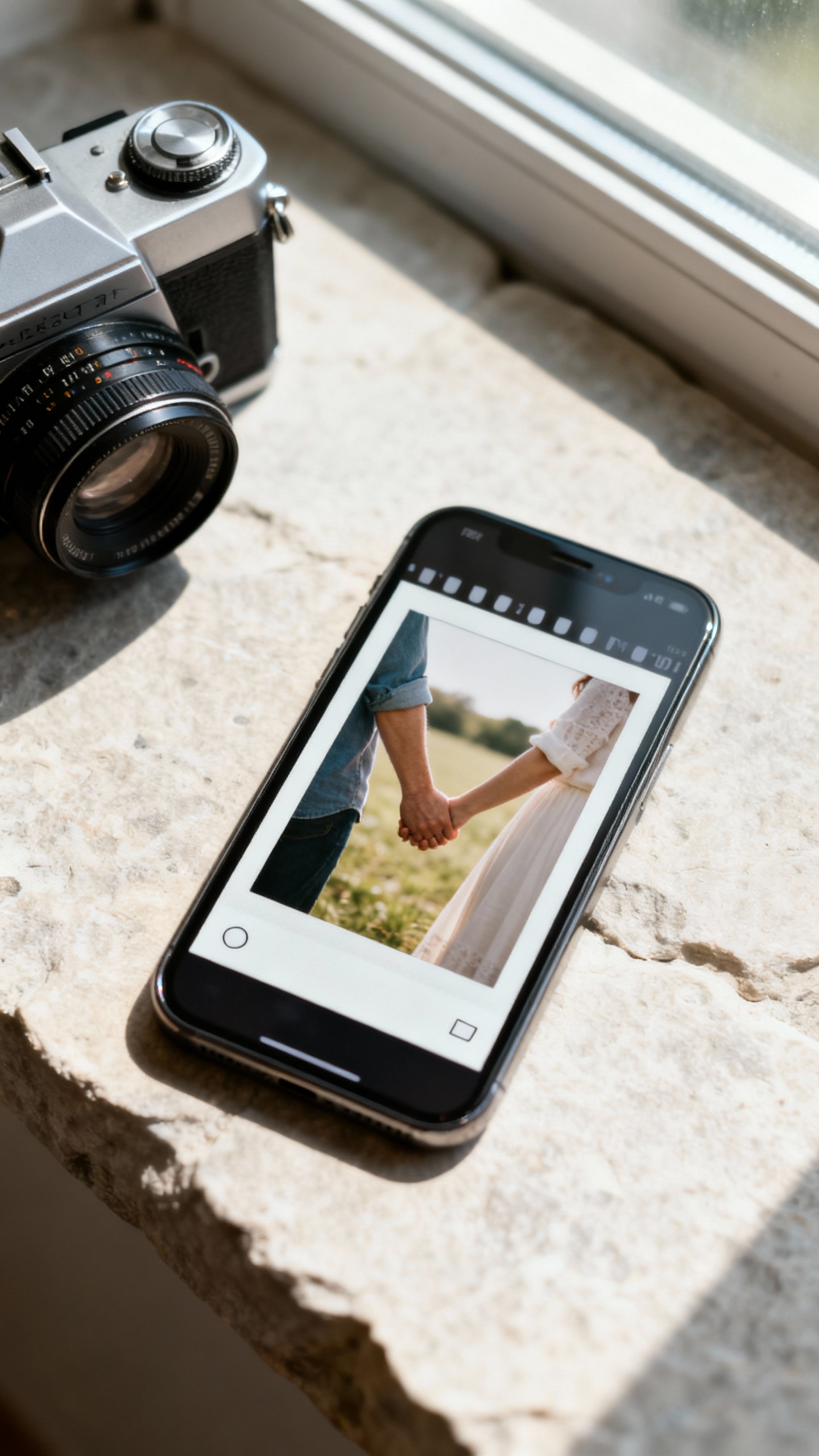 Use one strong engagement photo and frame it with a subtle 35mm film border or Polaroid-style edge for a modern editorial look. The luxury trick: keep the text minimal and let the image breathe, like a high-end brand campaign. Choose a neutral-toned photo (soft greens, stone, beach, city neutrals) so it feels expensive, not busy.