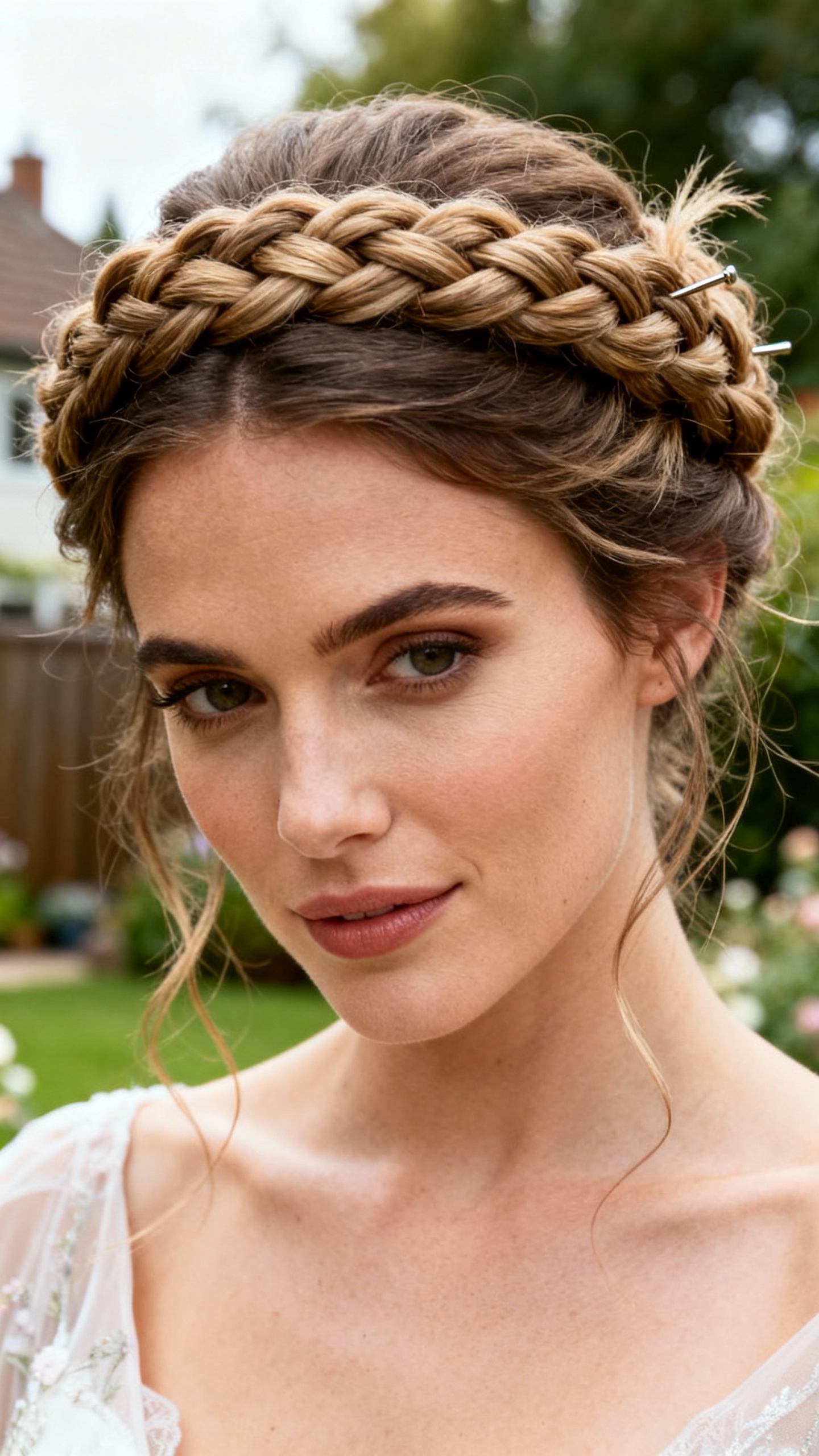 This braid-around-the-head updo gives fairy-garden energy in the best way, and it’s ideal for outdoor weddings because it holds up even if the weather isn’t perfect. It flatters most face shapes, especially if you keep the braid slightly loose and pull out a few wispy pieces near the ears. For grip, don’t start on freshly washed hair—day-two hair (or a little dry shampoo) makes braiding so much easier. Add tiny flowers or baby’s breath along the braid, and pin them with mini U-pins so they don’t slide out.