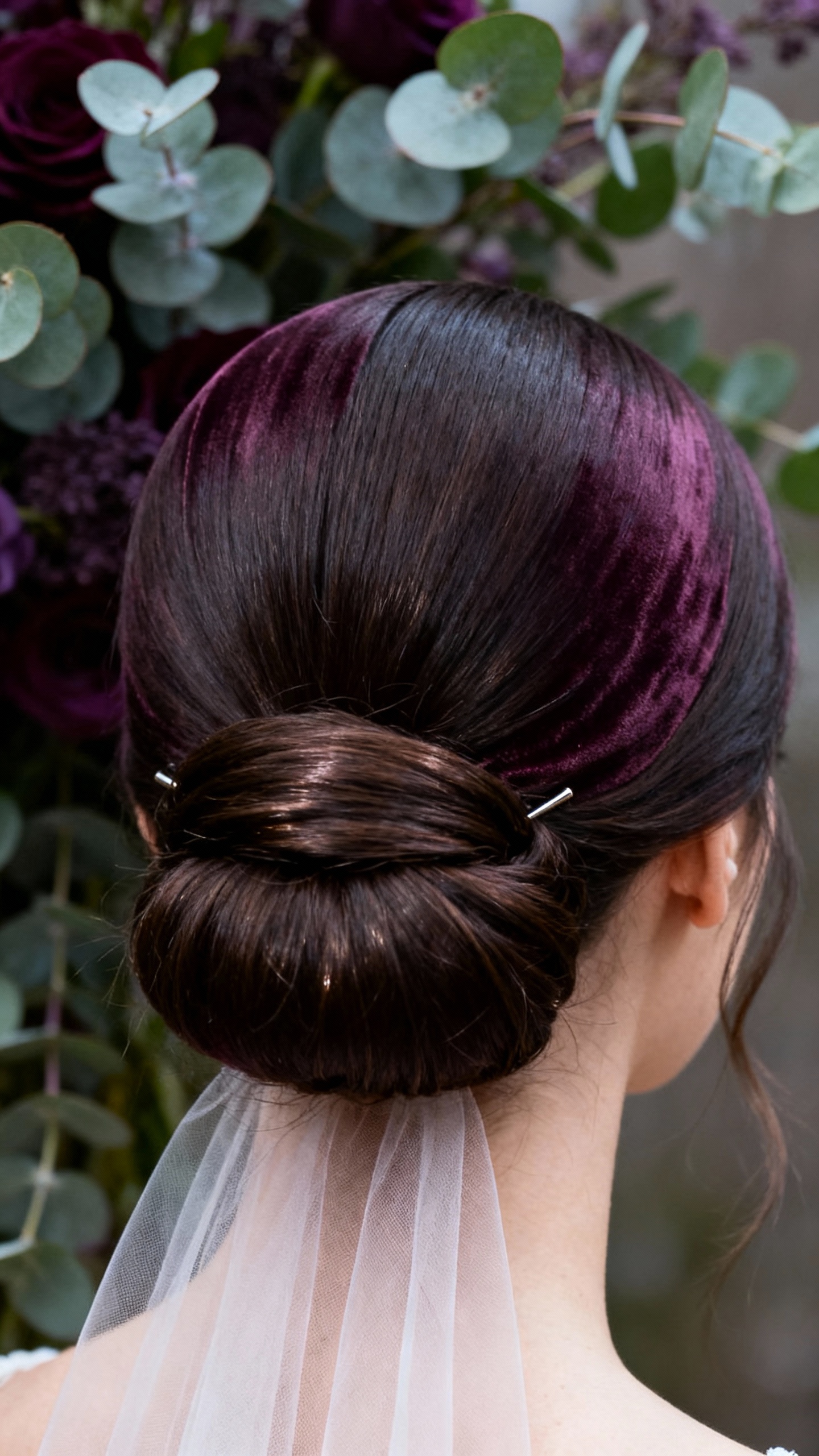 This is the chic, editorial option that looks expensive with moody palettes like merlot, eucalyptus, and smoky plum. It flatters oval, heart, and longer face shapes because the center part creates symmetry and the low placement elongates the neck. For hold, ask your stylist for a “silky set” (smooth blowout + light wax/cream) and finish with a flexible hairspray so it won’t look crunchy in close-ups. Veil tip: place your veil just above the chignon for a seamless, clean line in photos.