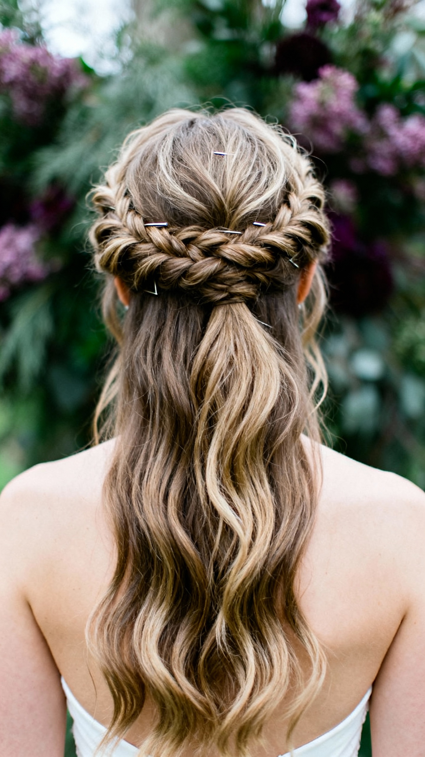 A twisted half-up is the perfect in-between if you want your hair down but still need it out of your face for vows and portraits. It flatters round and square face shapes especially well because the crown lift and soft front pieces create length and softness. For texture that lasts, prep with a volumizing mousse at the roots and a light texture spray through mid-lengths before curling. Accessory tip: a small cluster of pearls or a dark floral pin looks stunning against moody palettes without feeling too “summer bride.”