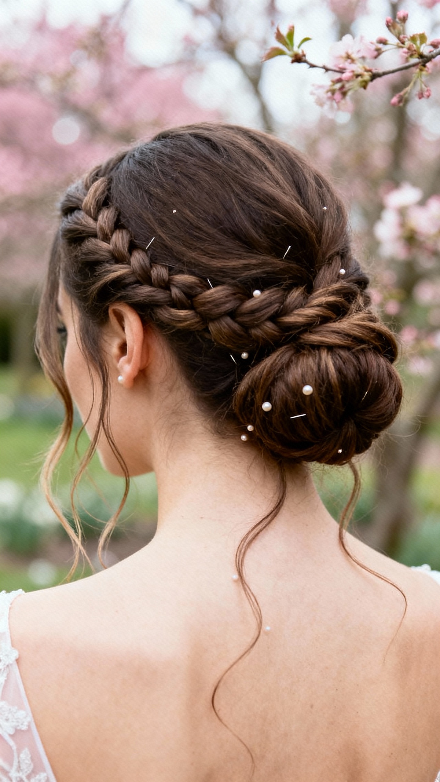 This look is romantic but grounded—perfect for gardens that are just starting to bloom and palettes with dusty rose, sage, and espresso accents. It flatters most face shapes because you can customize the tendrils: keep them longer for a slimming effect or tuck them closer for a cleaner frame. For staying power, have your stylist “anchor” the braid with a few hidden pins before wrapping into the bun, then finish with a humidity-resistant spray (early spring can be sneaky). Veil placement: tuck the veil under the bun if you want the braid detail visible from the back.
