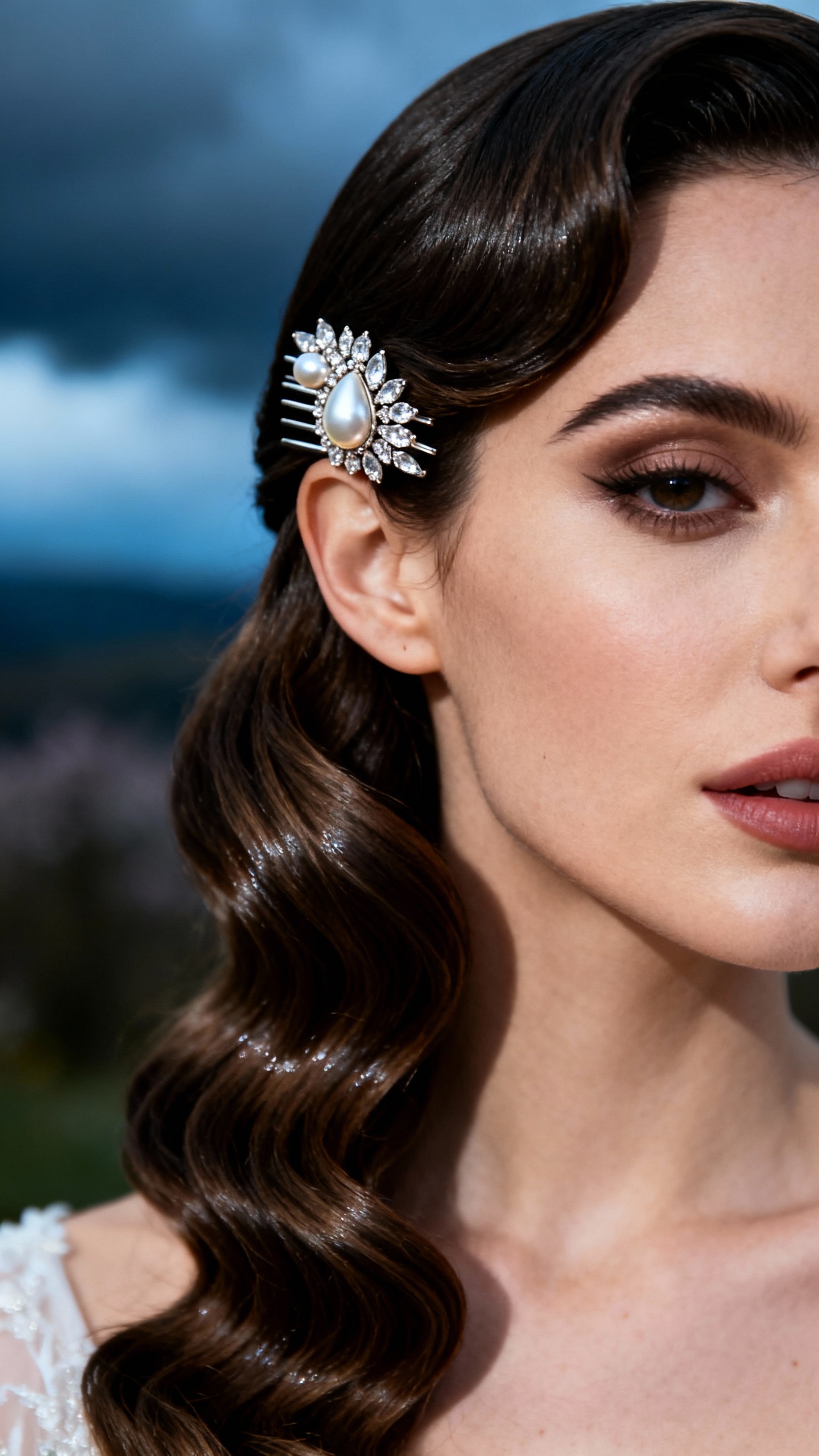 Side-swept waves bring instant old-Hollywood romance, and they pair so well with stormy blues, charcoal tuxes, and deep berry bouquets. This style flatters diamond and heart face shapes because the side part balances cheekbones and softens the forehead area. Practical tip: set your curls in one direction and clip them to cool (even 10 minutes helps) so the wave pattern stays defined through photos and dancing. Accessory tip: choose a statement clip in antique gold, gunmetal, or crystal to echo the moodiness without overpowering your dress.