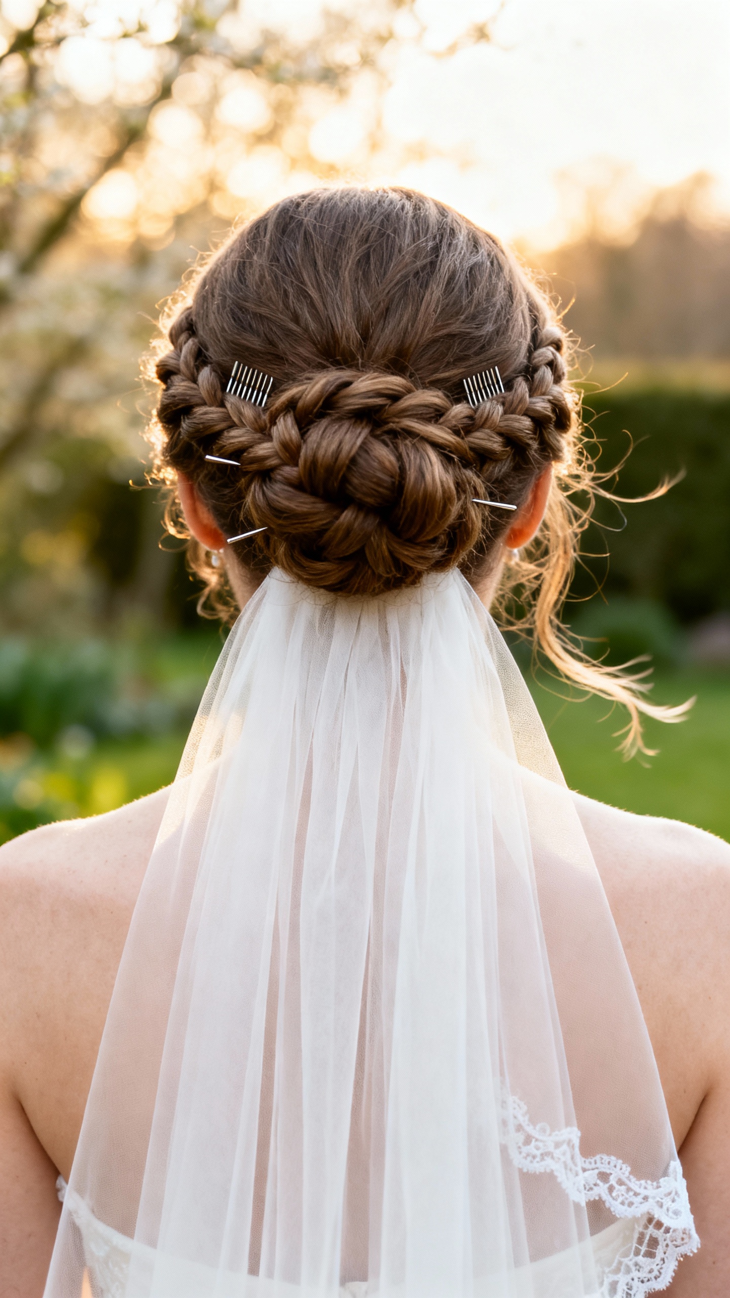 A braided low bun is the “pretty but secure” option—perfect for outdoor ceremonies, garden venues, and anyone who wants texture that reads on camera. It flatters thick hair (and fine hair with extensions) and gives a slightly boho-luxe vibe that looks gorgeous with a cropped jacket or faux-fur wrap. Practical tip: place the veil comb at the center-back of the head (not too high) so the cathedral length drapes smoothly and doesn’t bunch over jacket seams.