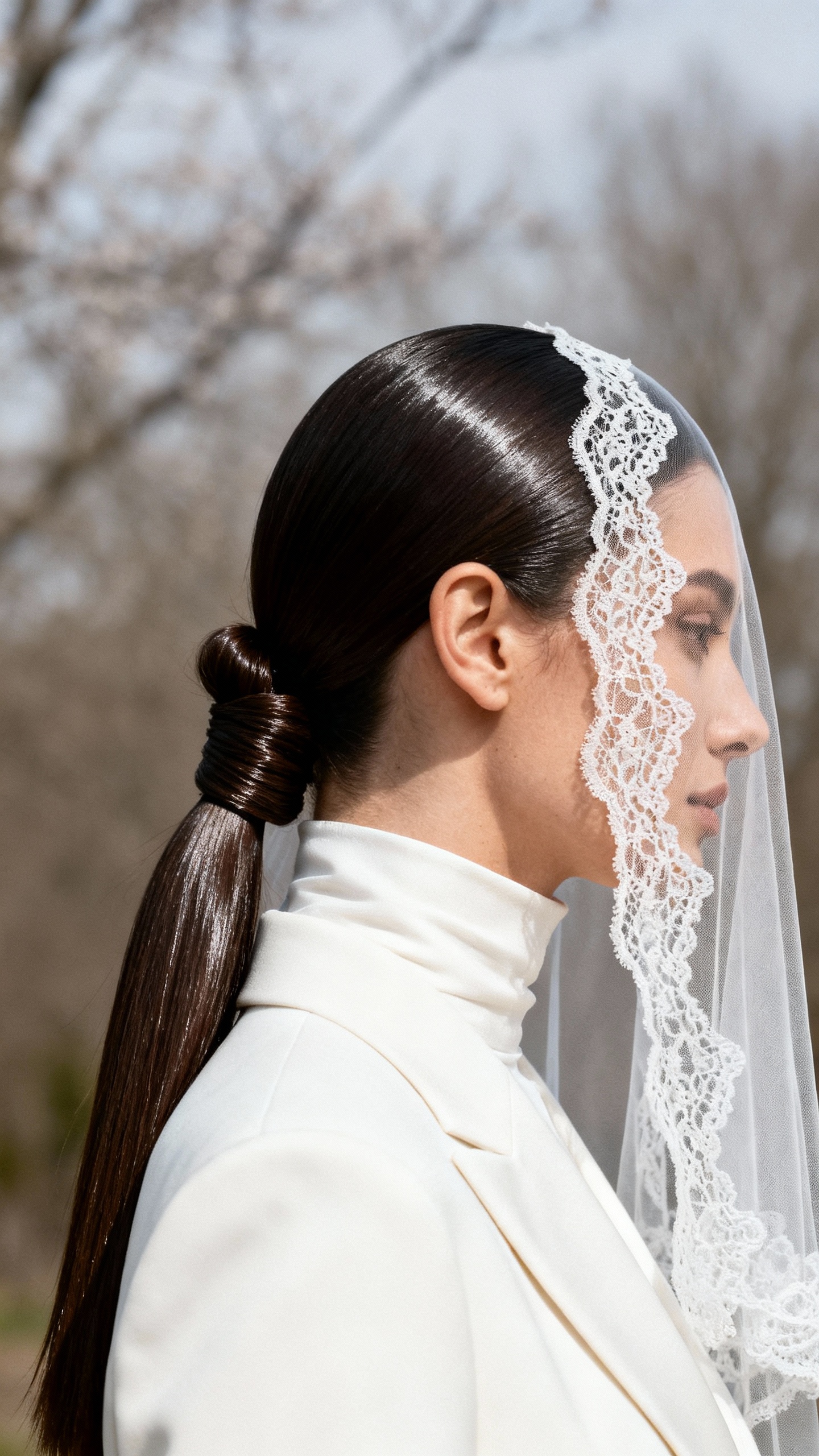 This is for the bride who loves clean lines and fashion energy: a sleek low ponytail photographs like a dream with tailored jackets and high necklines. It flatters angular and oval face shapes, especially when you keep the part crisp and the base snatched. Practical tip: for a mantilla veil, smooth a light serum through the top and secure the veil with discreet pins near the temples so it stays put without crushing the ponytail’s shape.