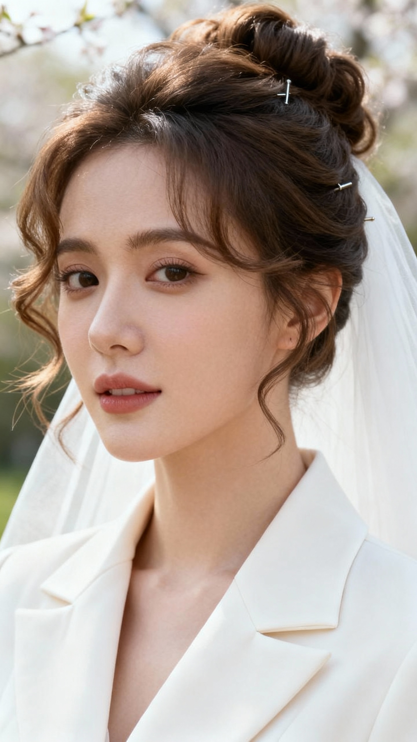 This sleek-but-soft low chignon is a forever classic that flatters almost everyone, especially oval and heart face shapes. The vibe is clean, timeless, and ultra photogenic with a blazer, cape, or structured jacket because it keeps volume low at the collar. Practical tip: place the veil comb under the chignon (not on top) so it doesn’t snag on lapels and stays anchored through hugs.