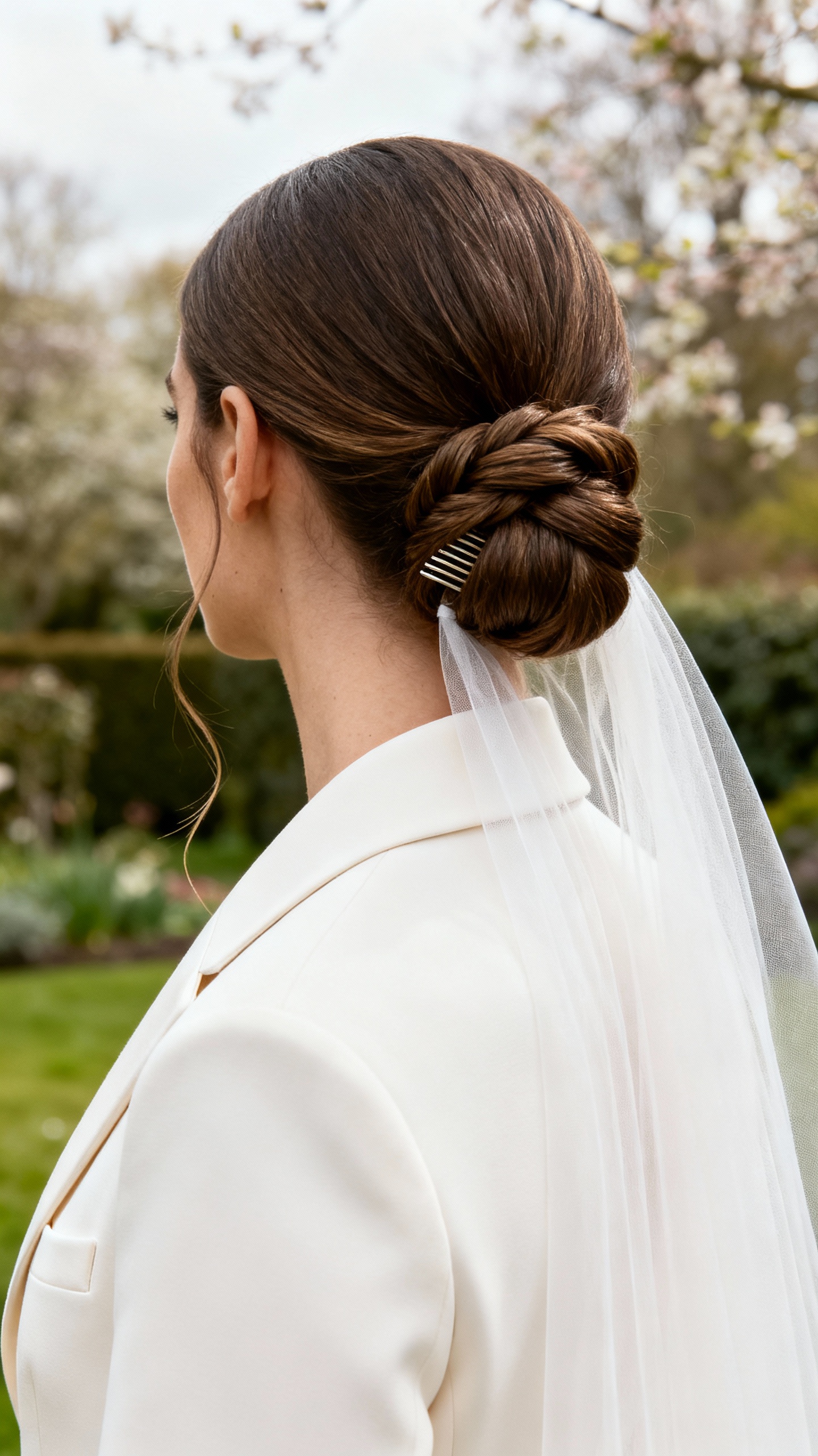 Yes—just keep the hairstyle clean at the back so the veil can drape without bulk. A braided low bun or low chignon is ideal, and placing the comb at center-back (not too high) helps the veil fall in a straight, photogenic line behind the jacket.