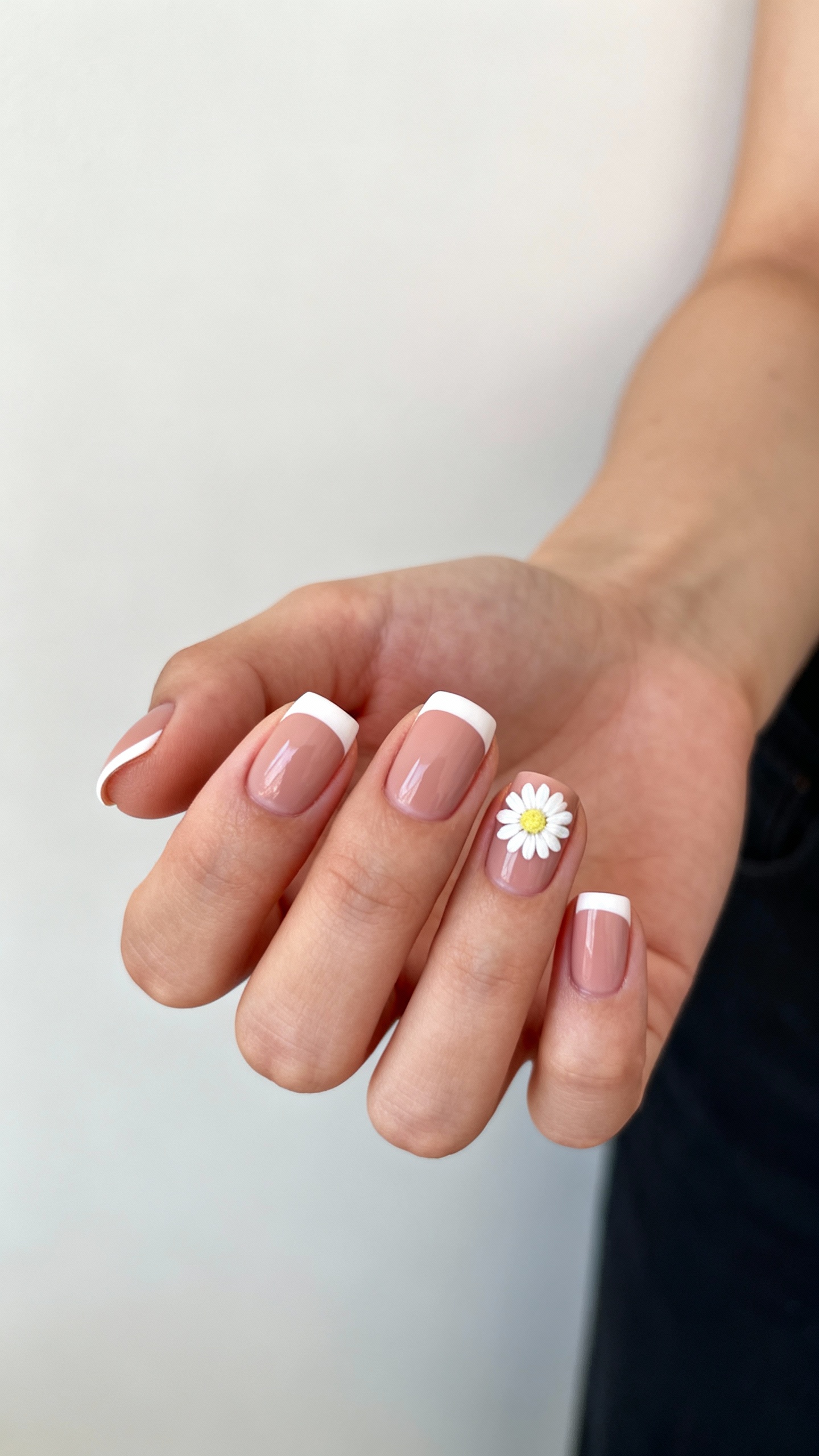 Start with a nude or pinky-beige base, add a super-thin micro French tip, then place a tiny daisy tucked into one corner of an accent nail. The vibe is “timeless with a wink,” and it looks especially crisp on short square or squoval nails because the micro tip elongates without needing length. Choose gel for the French line (it stays sharp longer), and ask your tech to use a slightly off-white for the daisy so it doesn’t glare under flash photography.