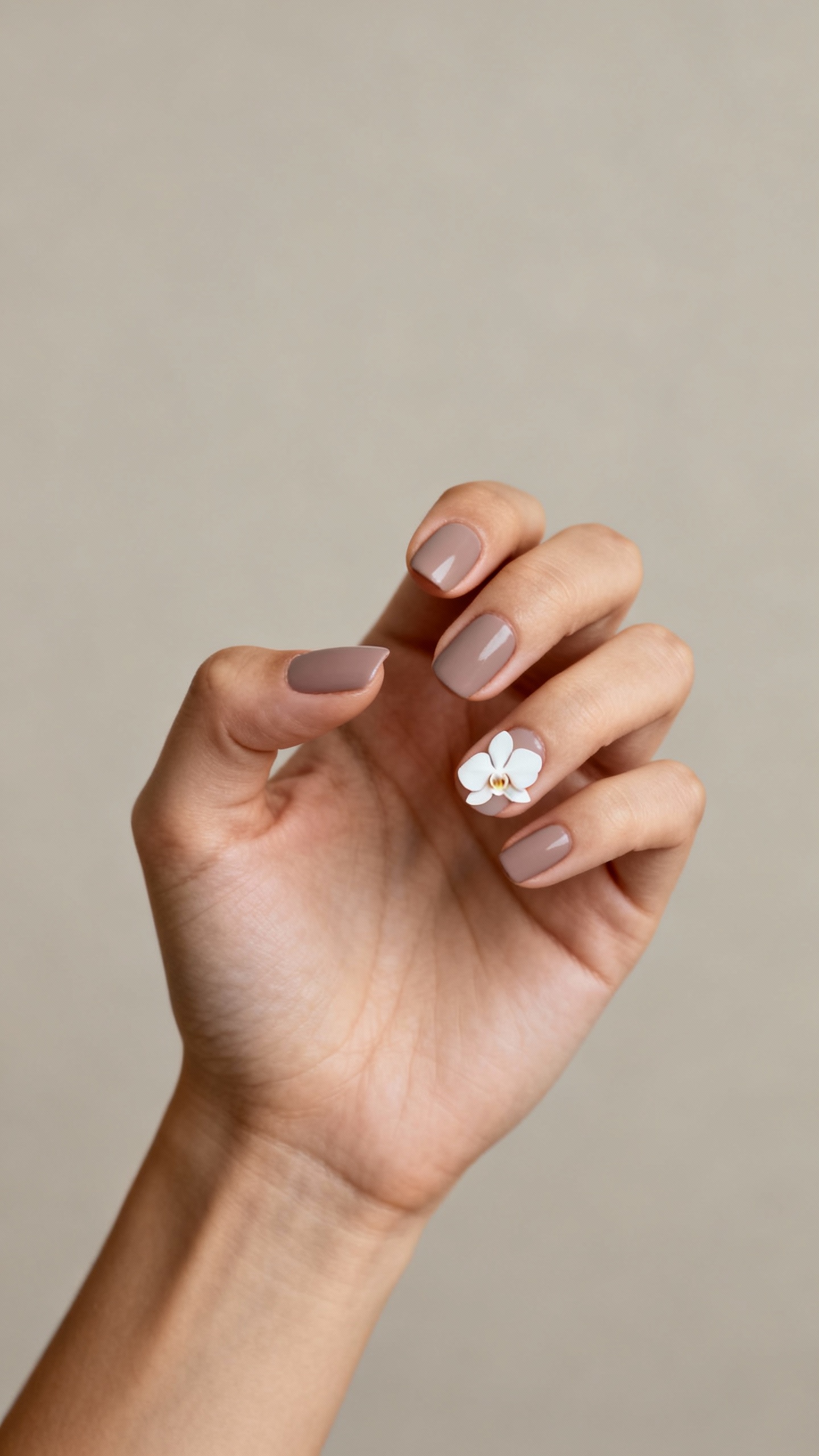 5) Soft Taupe Nude + White Orchid Petal Accent (Negative Space)