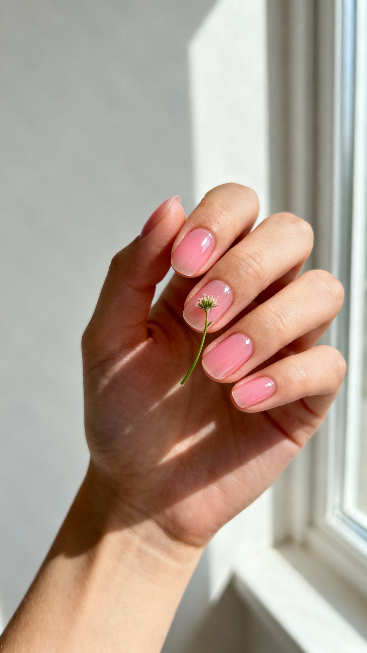 4) Sheer Pink “Lip Gloss” Nails + Tiny Wildflower Stem Accent