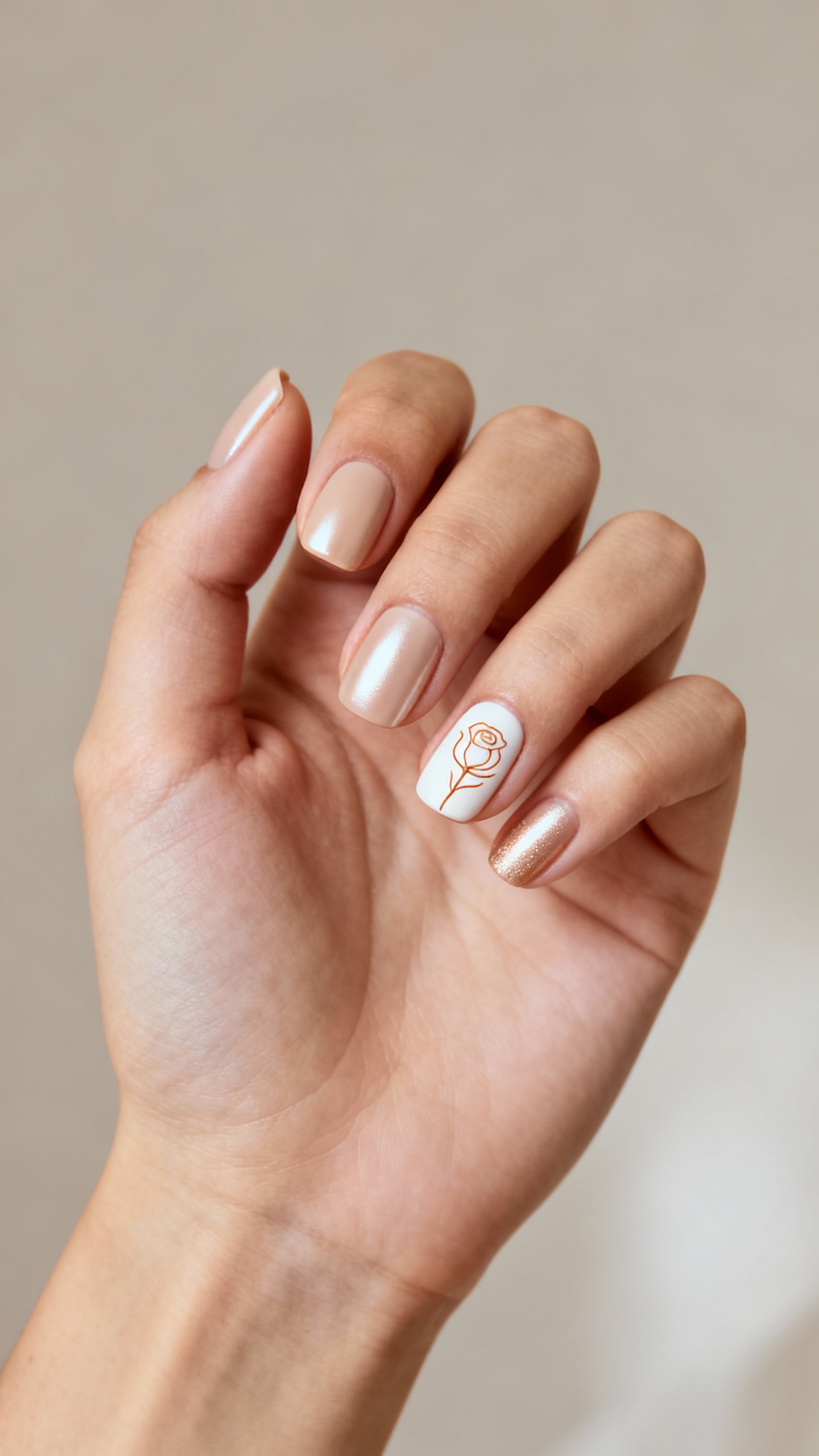 3) Satin Pearl Nude + Minimal Rosebud Line Art