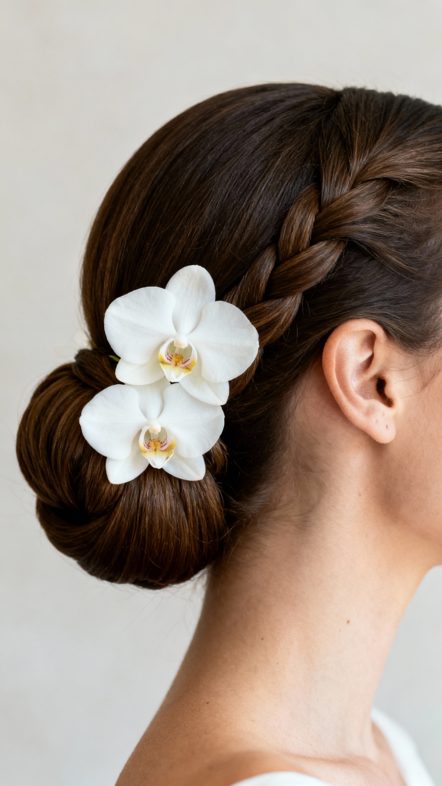 2) Orchid-Accented French Twist (Minimal Hair, Maximum Impact)