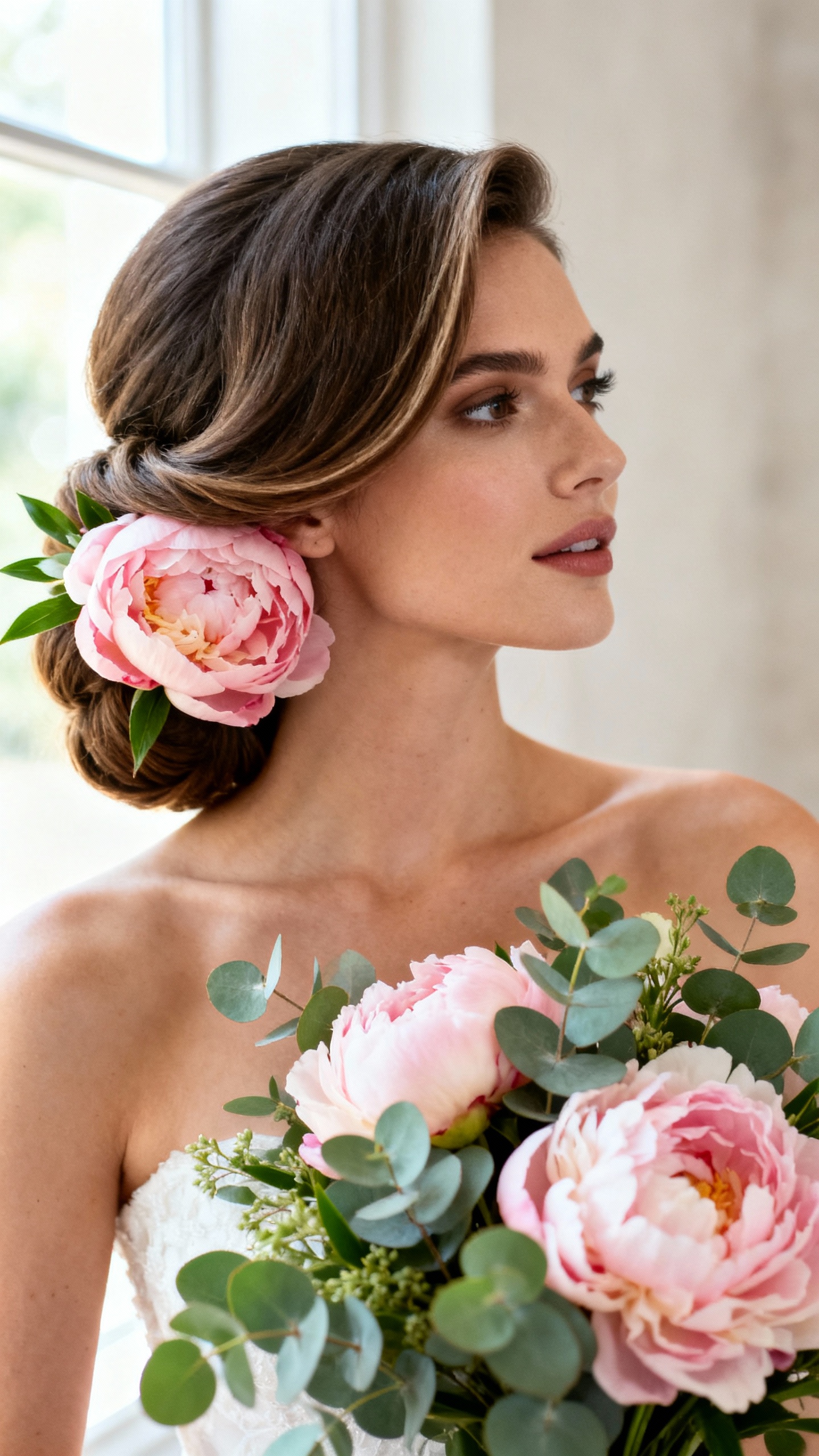 5) Peony + Greenery Side-Swept Updo (The “Statement Arrangement”)