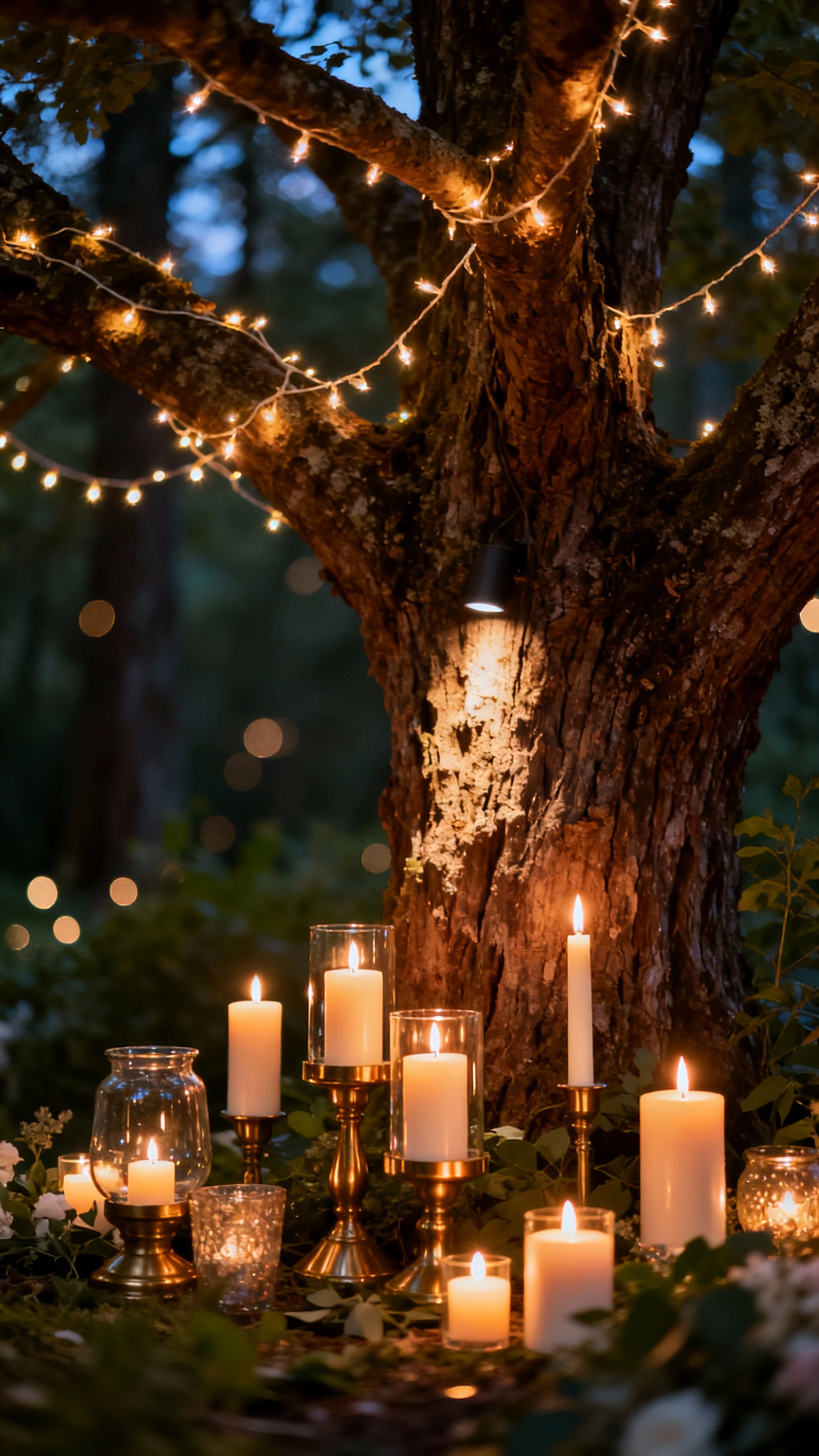 Skip one-note string lights and layer your glow: warm fairy lights, clusters of candles (real or LED), and a few pin-spot uplights aimed at trees or greenery. The goal is soft, scattered light—like you wandered into an enchanted clearing. Keep bulbs warm (around 2700K) so photos look romantic, not harsh or blue.