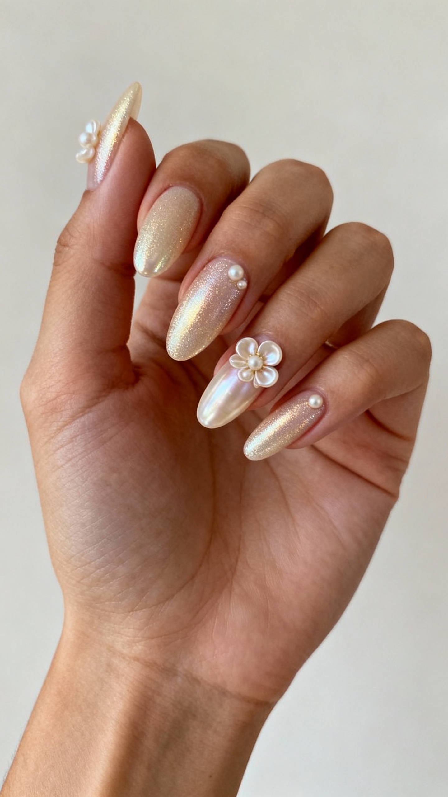 4) Champagne Pearl Shimmer + 3D Pearl-Flower Accents