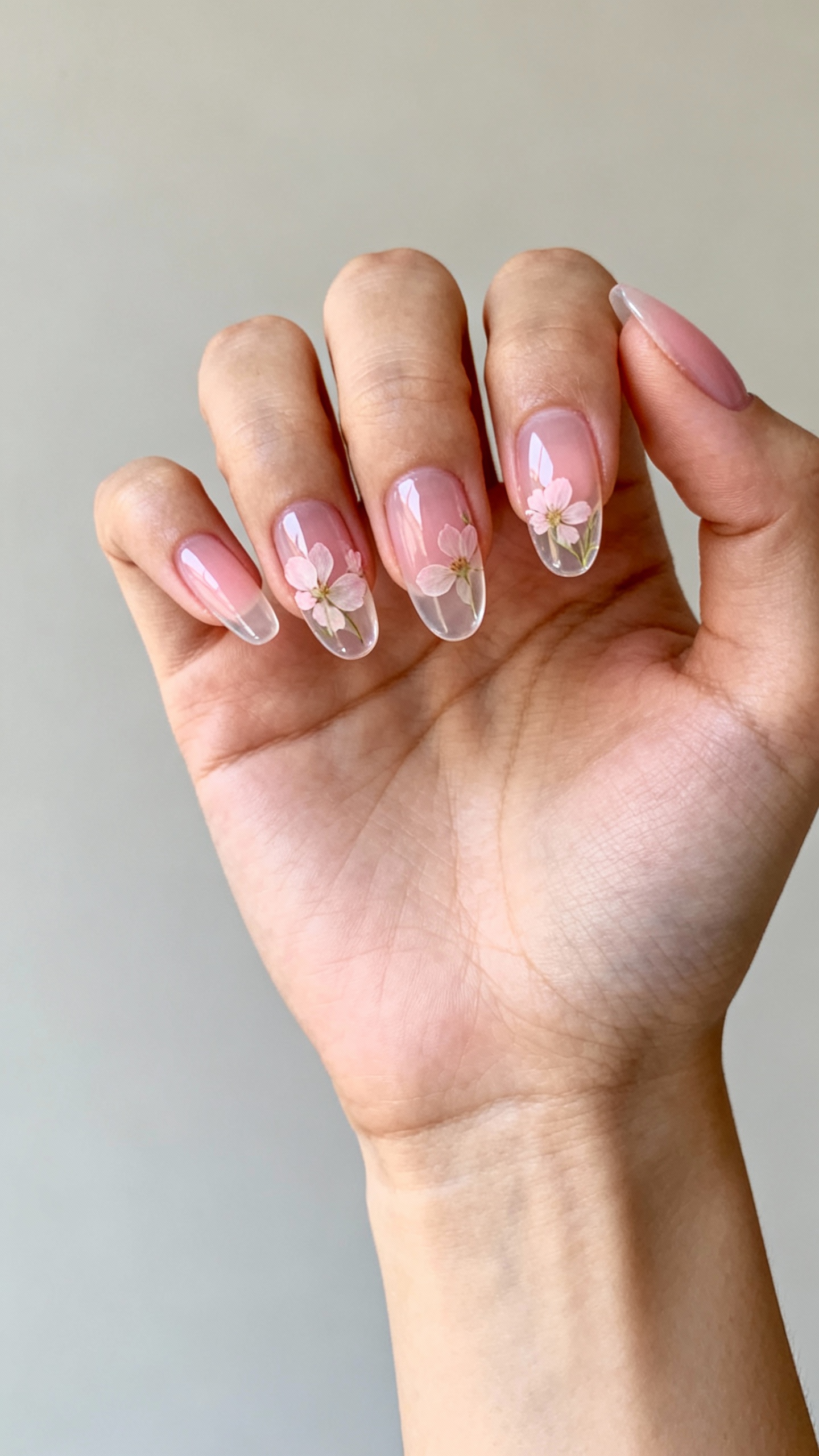 If you want romantic and natural but still elevated, a sheer ballet pink is your best friend—especially with delicate pressed-flower pieces or translucent floral decals. It flatters every skin tone and looks like your nails, but upgraded, and it’s stunning on medium almond or soft square. Keep the flowers in soft tones (pale mauve, ivory, dusty rose) so the look stays expensive, not busy. Wear tip: seal any dried/pressed elements under a builder gel overlay so nothing snags on lace, tulle, or hair.