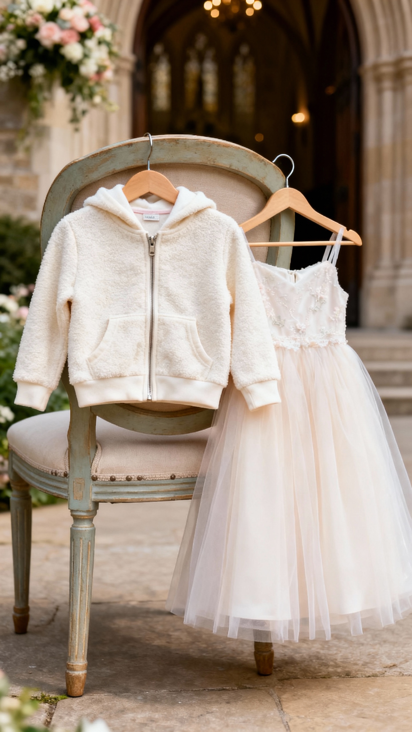 If your ceremony is outdoors, in a church, or during a cooler season, a cozy layer is a lifesaver—especially for little ones. A soft cardigan or zip hoodie in an ivory or pastel tone looks nice in photos and prevents the “I’m cold” wiggles. She’ll keep wearing it to school, on planes, and for weekend errands with her family.
