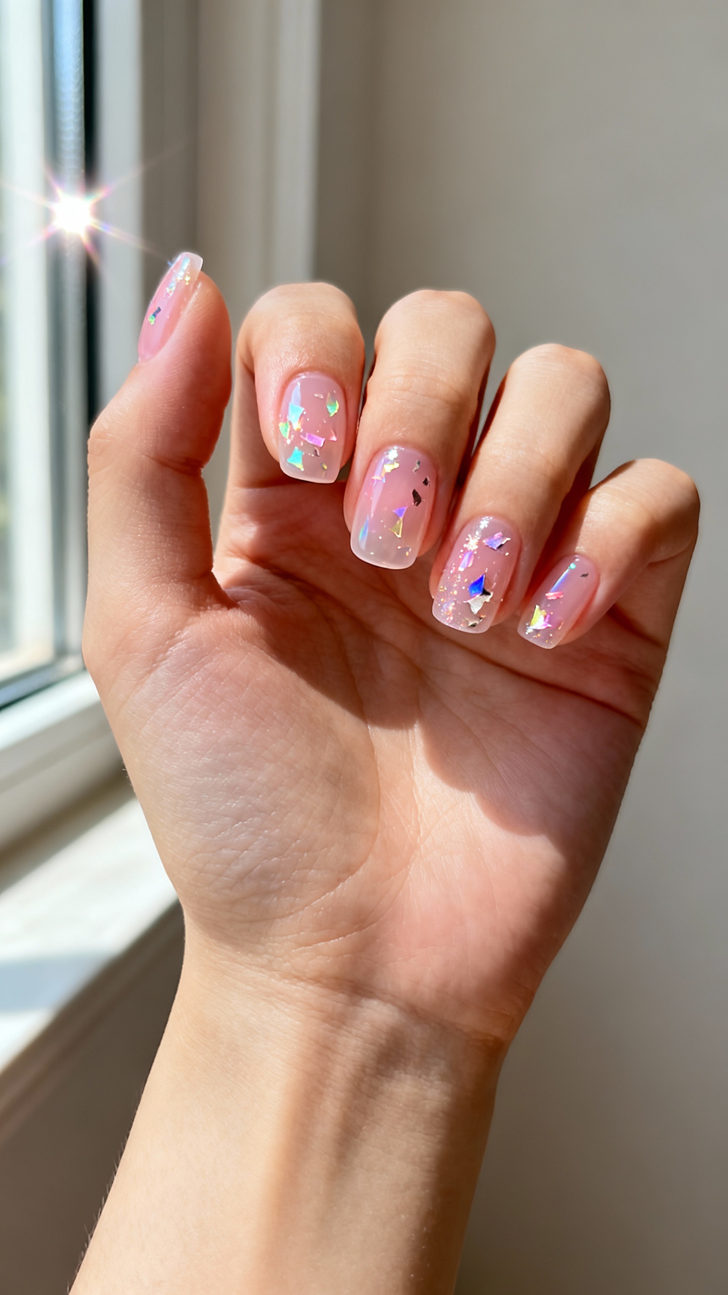 This one is for the bride who wants fun without losing that clean wedding vibe: a translucent jelly pink (like your nails but better) with scattered iridescent foil flakes. The flakes flash rainbow in candids—especially when you’re moving—without stealing attention from your ring. Looks amazing on short to medium squoval or almond for that fresh, modern shape. Wear tip: keep flakes sparse and sealed under two thin top coats so the surface stays glassy (foils can lift if they aren’t fully encapsulated).