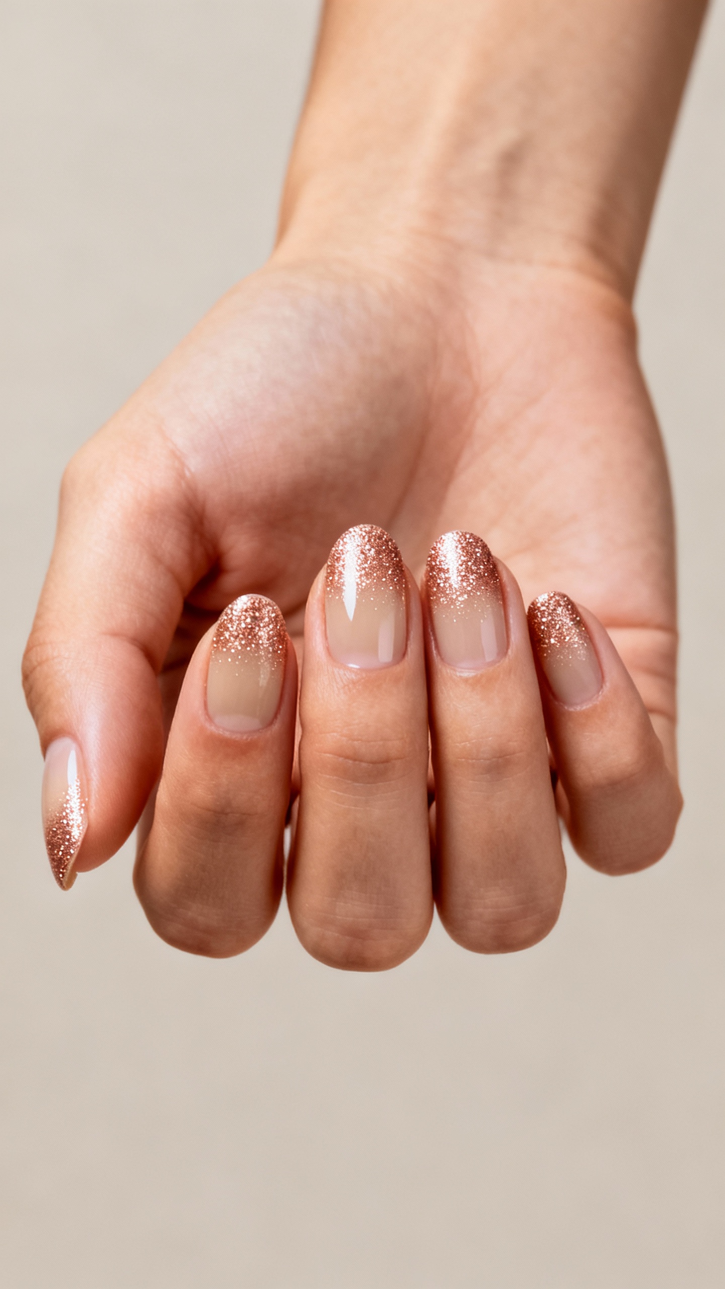 A reverse glitter ombré starting at the cuticle feels like a tiny celebration every time your hands move—plus it hides grow-out like a pro. Use champagne microglitter or rose-gold shimmer over a nude base, faded softly upward so it’s sparkly but still elegant in photos. Medium almond is the sweet spot for elongating the fingers while keeping the fade smooth. Wear tip: if you’re doing your nails 5–10 days before the wedding, this design is a lifesaver because the half-moon sparkle makes new growth way less noticeable.