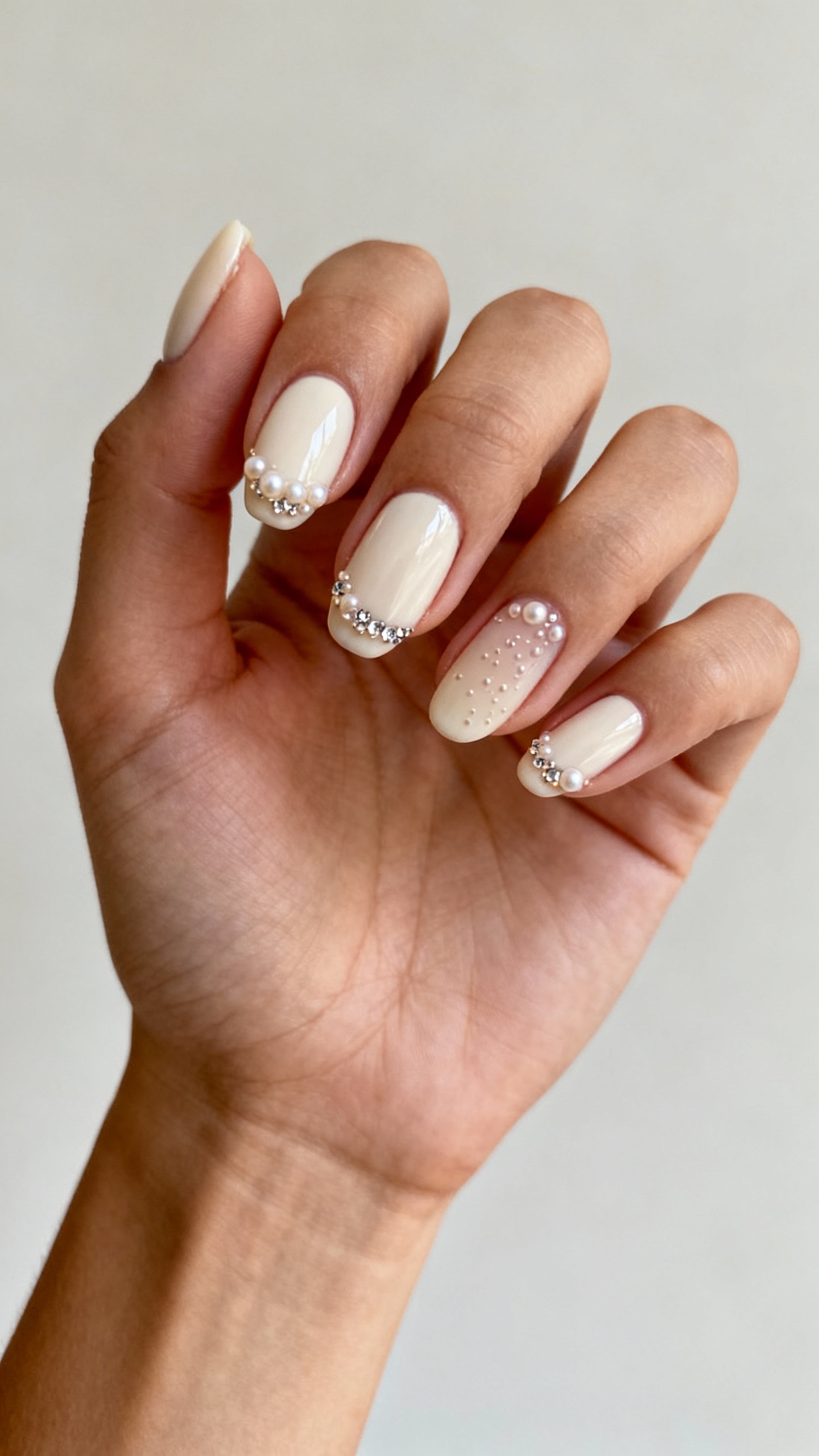Imagine tiny pearls and baby crystals clustered like champagne bubbles—placed on one or two accent nails so it photographs cute, not costume-y. Keep the base a milky ivory or blush so the pearls look intentional and bridal, then add a little “fizz” near the cuticle or along one side. Short to medium oval is perfect because it feels dainty and won’t catch on your dress. Wear tip: go gel and ask your nail tech to cap the gems with builder gel edges so they don’t pop off during hugs and hair adjustments.