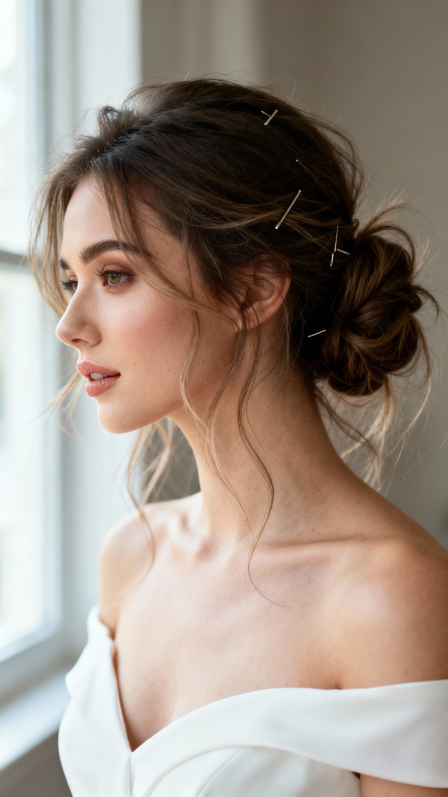 This is the “we’re just vibing” bun that still looks bridal in every candid. It flatters most face shapes (especially round or heart) because the loose pieces create softness and dimension. The vibe is romantic, slightly undone, and super photogenic when you’re moving around. Tip: ask for a textured base (dry texture spray or light backcomb) so the bun stays put without looking tight, and place the veil above the bun for easy removal during dancing.
