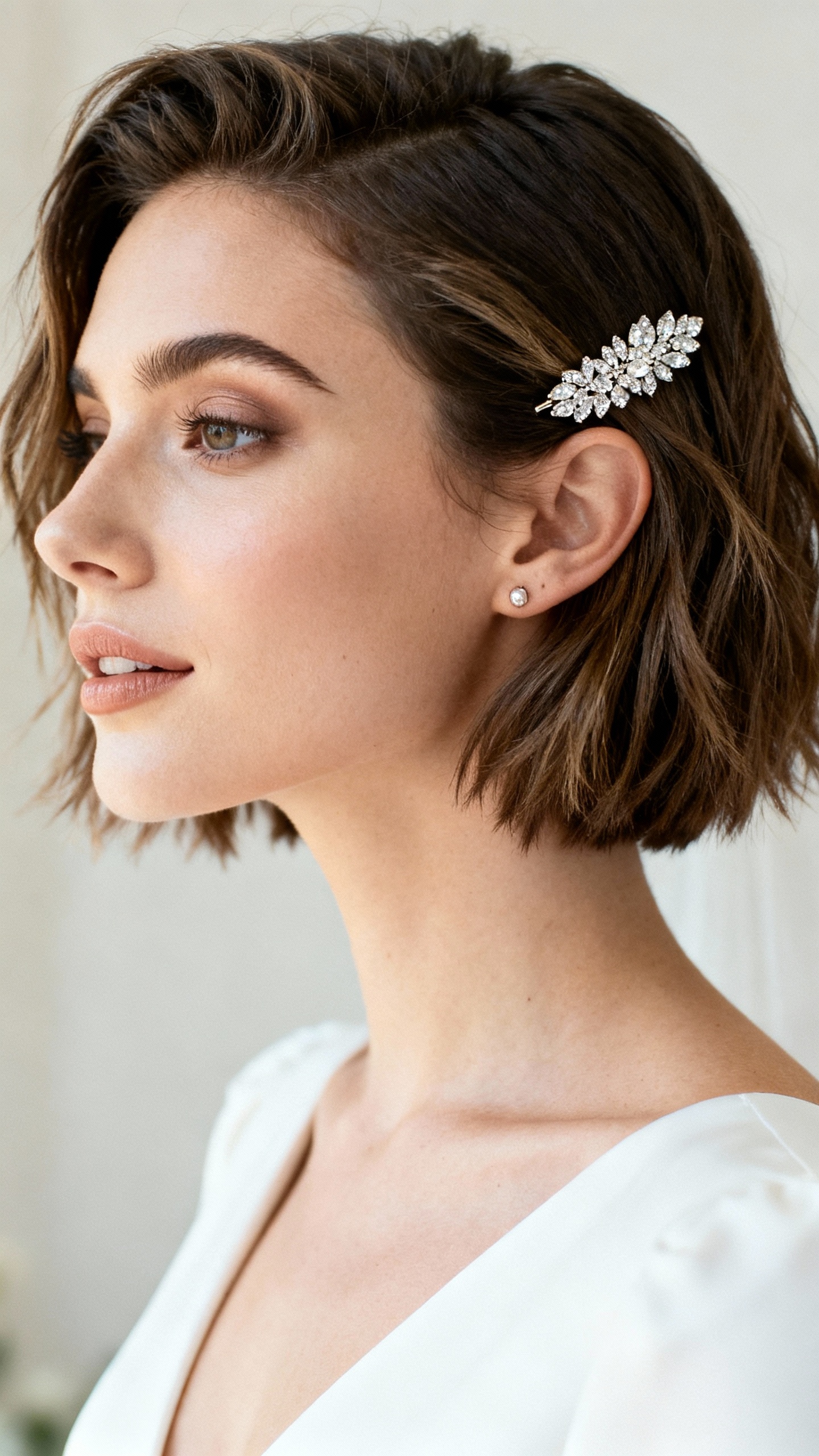 If you have a bob, lob, or pixie, this is the fun, low-effort style that photographs like you planned it for weeks. It flatters smaller face shapes and sharp jawlines, and it’s ideal if you want your features to shine while you’re laughing mid-walk. The vibe is cool-girl bridal: polished, a little playful, and very “I’m not here to fuss with curls all day.” Tip: add a matte texture paste for grip, then place a crystal clip above the ear on the heavier side of your part to keep hair out of your face (and make candids look intentional).