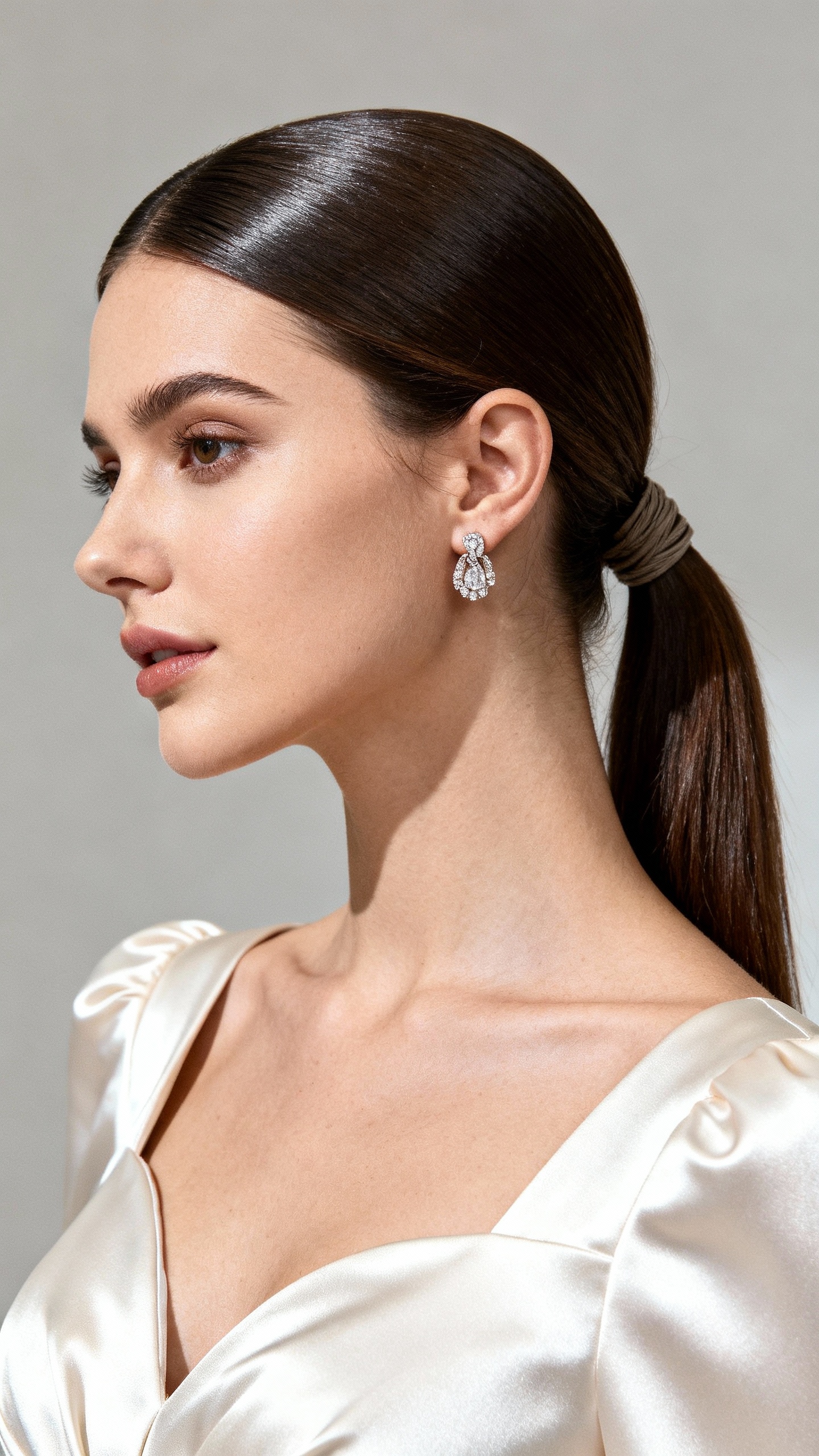 A sleek low pony is basically the cheat code for couples who want chic photos without overthinking anything. It flatters angular and oval face shapes (and looks amazing with statement earrings), plus it holds up through wind, travel, and a million kisses. The vibe is modern, editorial, and clean. Tip: prep with smoothing cream and a boar-bristle brush, then wrap a small section of hair around the elastic and pin underneath; if you’re wearing a veil, anchor it just above the pony so it sits flat and doesn’t slide.