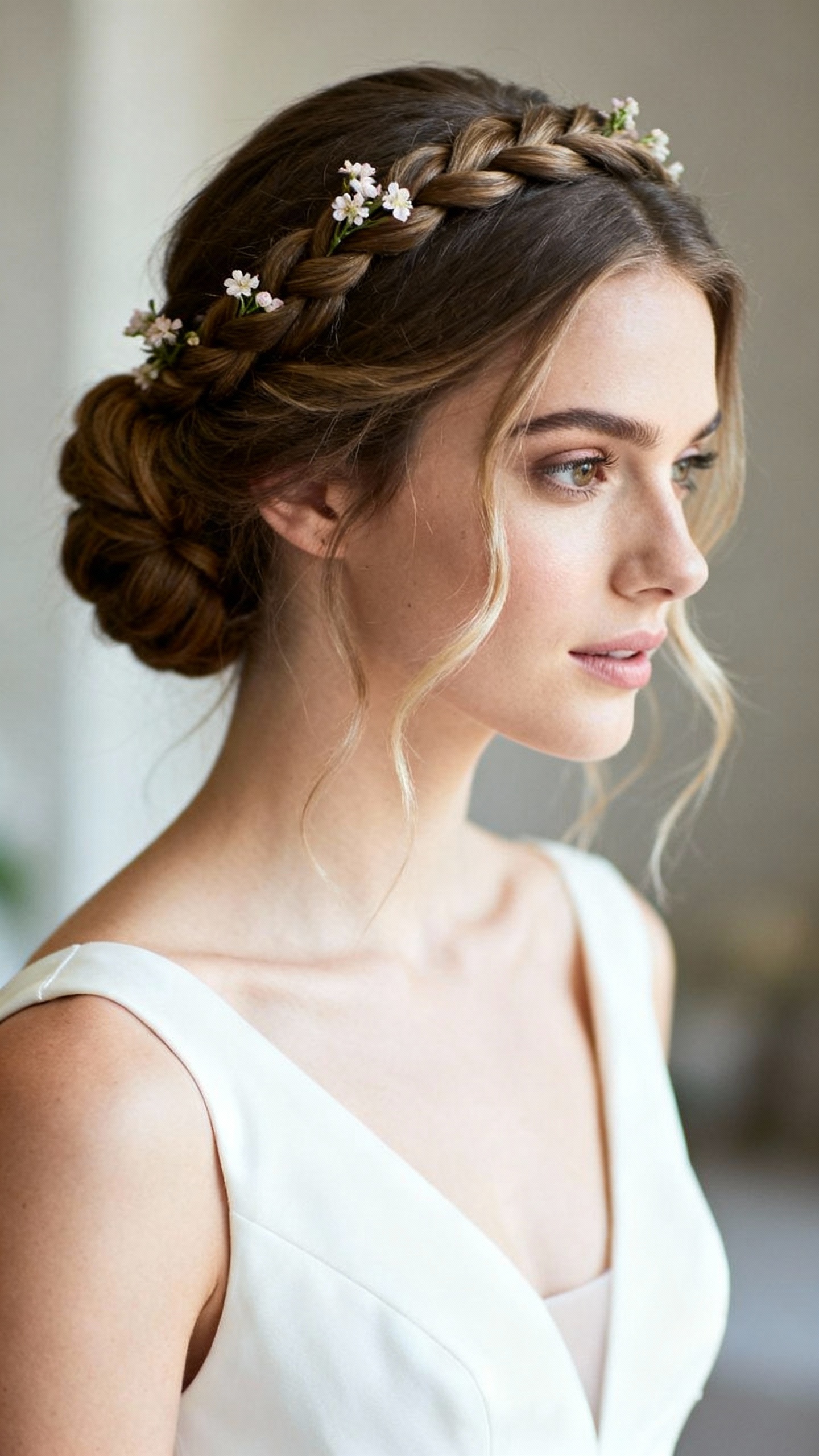 This style gives you structure (hello, long-lasting) but still reads soft and romantic on camera. It’s super flattering for round and square face shapes because the crown braid adds height and frames without harsh lines. The vibe is whimsical, “garden wedding,” and secretly practical when you’re moving nonstop. Tip: ask your stylist to pancake the braid slightly for a fuller look, and use hairpins that match your hair color so everything disappears in photos.