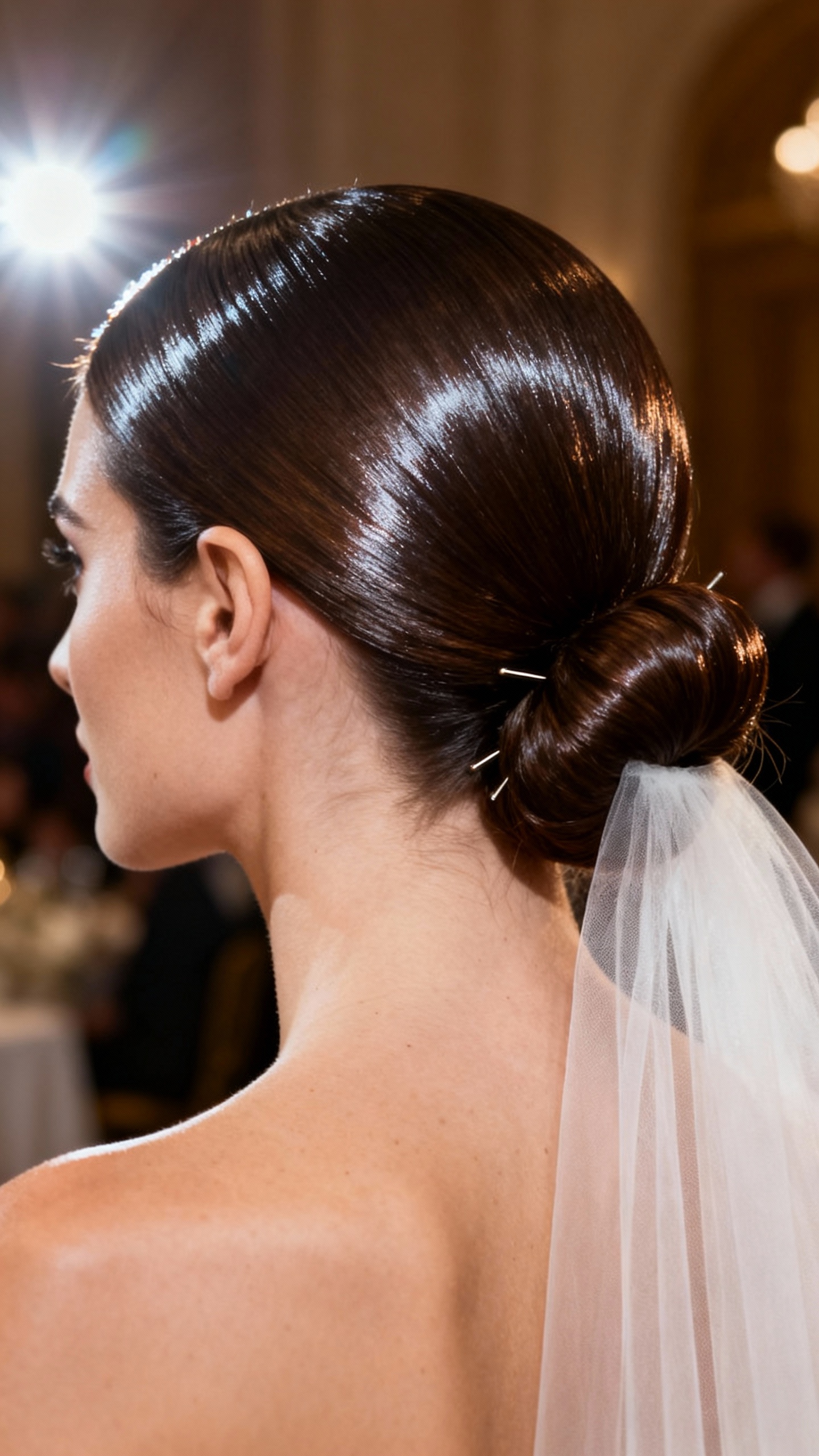 This is the ultimate “quiet luxury” updo that looks expensive in candlelight and clean in flash. It flatters oval, heart, and round face shapes, and it’s perfect for brides who want a polished, modern vibe without looking too “done.” Practical tip: keep the chignon low at the nape and ask for a shine spray that’s flash-friendly (light mist only) so indoor photos look glossy, not greasy.