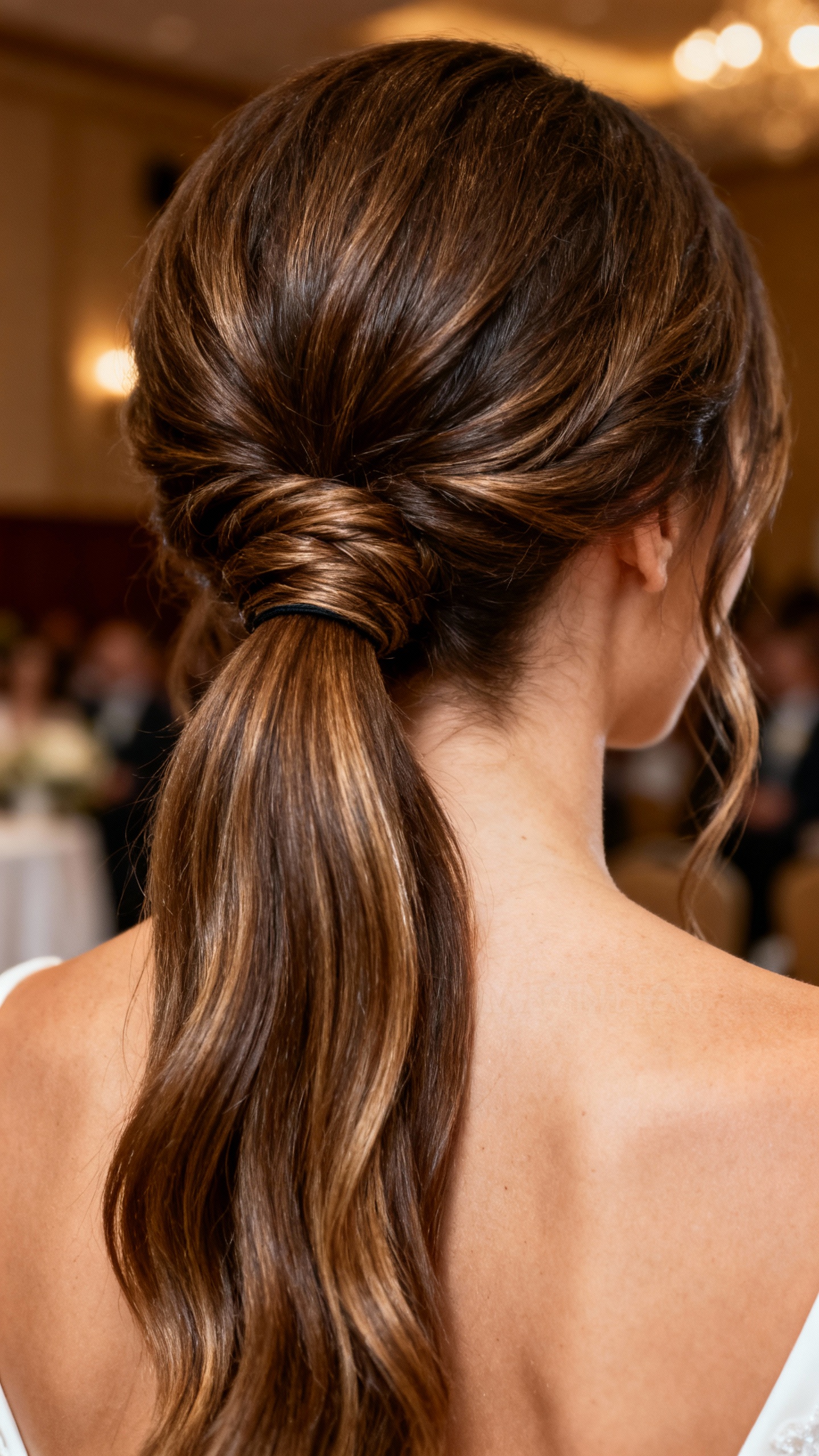 A low pony with texture is sleek-meets-effortless, and it photographs insanely well in indoor lighting because you get shine plus dimension. It flatters thick hair and extensions especially well, and it’s amazing for brides who want a modern silhouette or a minimalist dress moment. Practical tip: add a tiny tease at the crown and use a clear elastic plus a hair-wrapped base—then pin the wrap vertically so it stays secure through hugs (aka the real stress test).